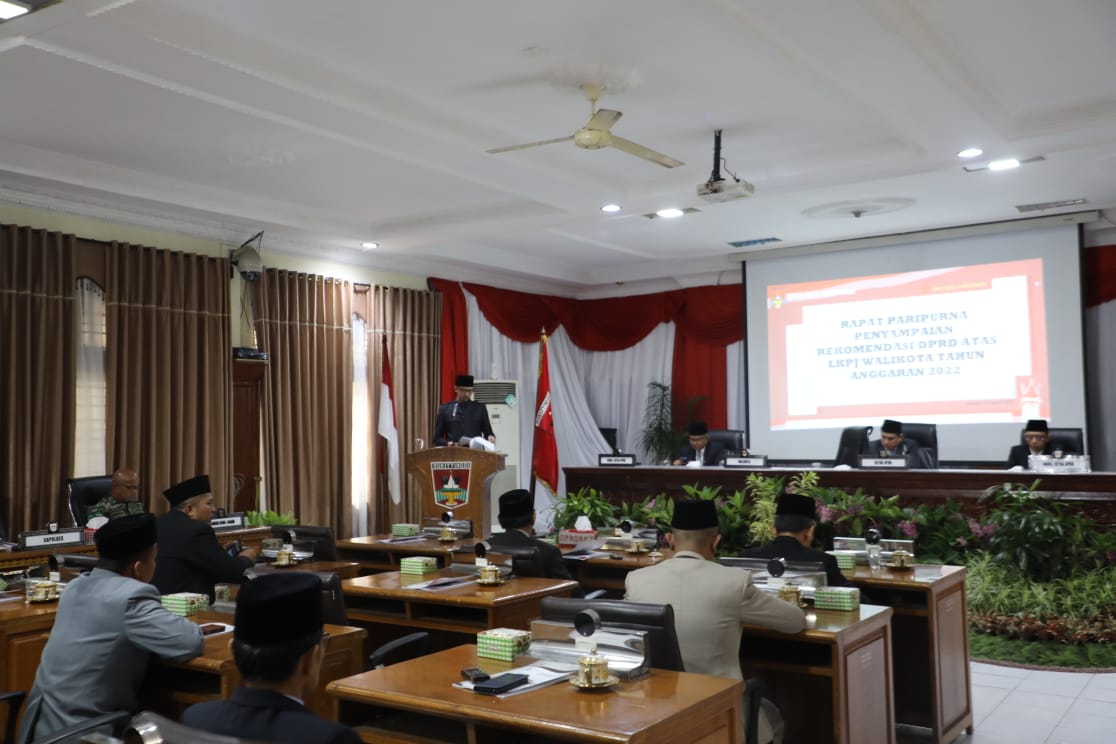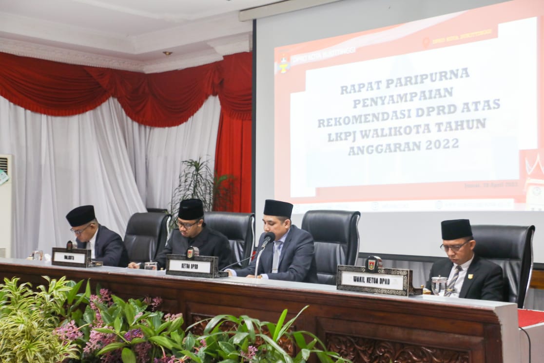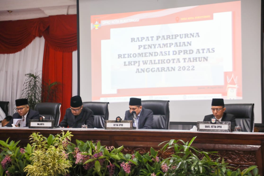 Bukittinggi, — DPRD Kota Bukittinggi sampaikan rekomendasi atas Laporan Keterangan Pertanggungjawaban (LKPJ) Wali Kota tahun anggaran 2022. Rekomendasi tersebut disampaikan dalam rapat paripurna, di Gedung DPRD Bukittinggi, Jumat (28/04).
