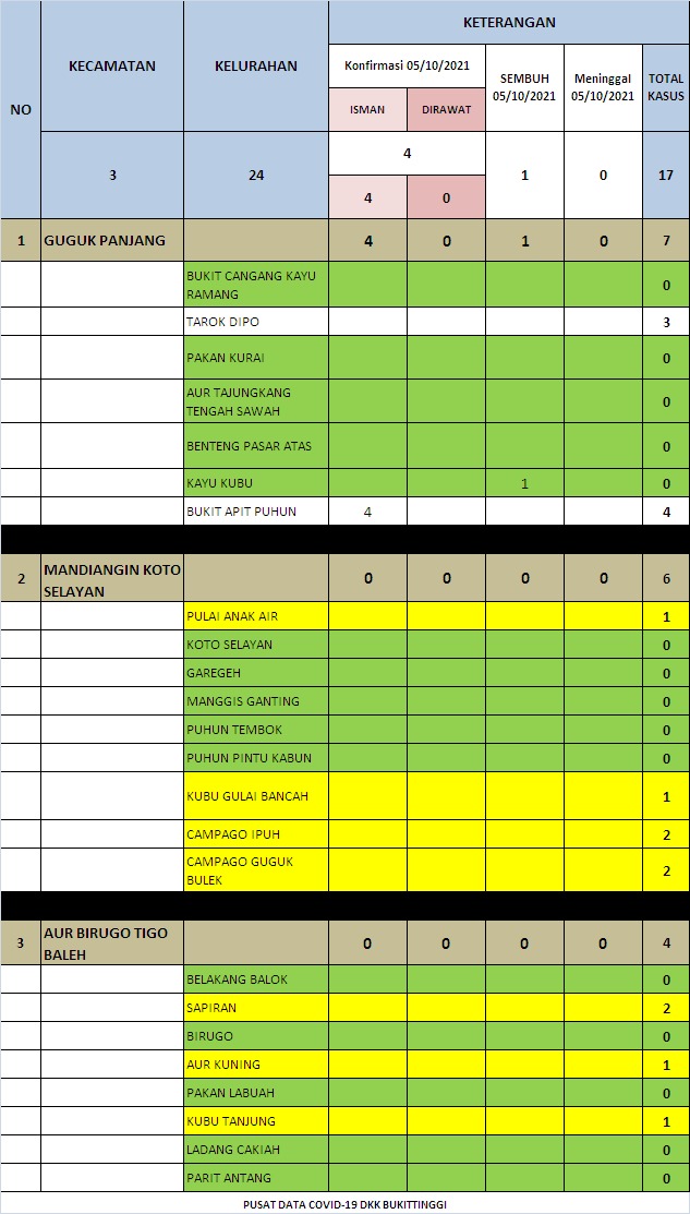 Bukittinggi- Virus carona atau covid 19 sempat hilang beberapa hari di Kota Bukittinggi Sumatera Barat,namun per tanggal 05 Oktober 2021 sebanyak 4 orang warga Bukittinggi terkonformasi positif Covid 19.