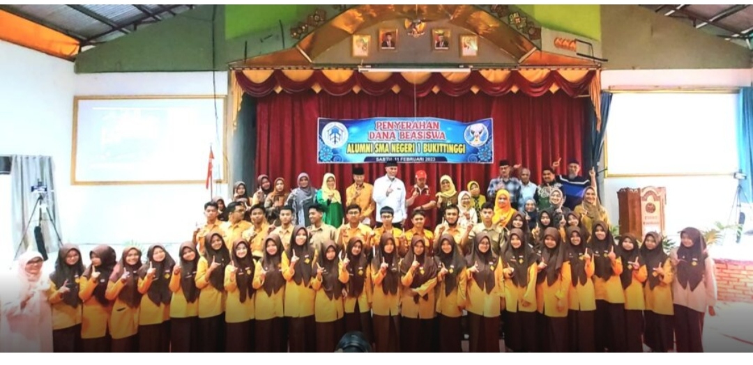 Beasiswa diserahkan secara simbolis Bupati Agam dan juga mantan Wali Kota Bukittinggi, di Aula SMAN 1 Bukittinggi, Sabtu (11/02/2023).