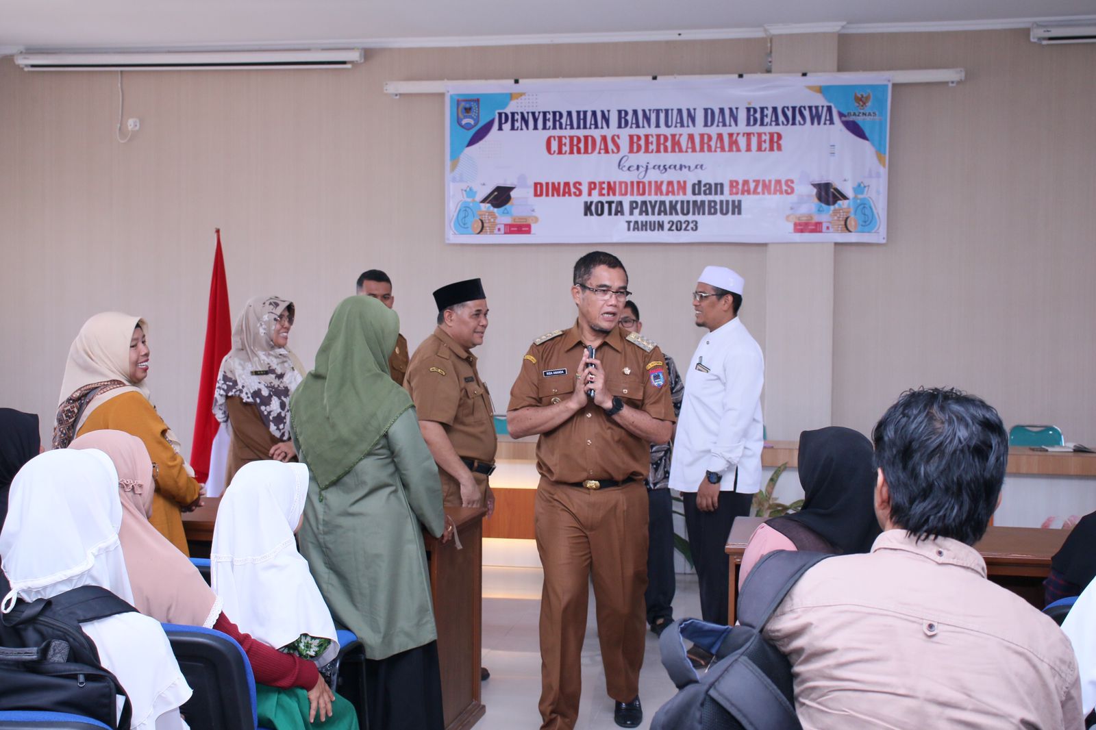 Payakumbuh – Pj. Wali Kota Payakumbuh menyerahkan bantuan dan beasiswa cerdas berkarakter kepada 40 penerima, yang merupakan kerjasama antara Baznas dan Dinas Pendidikan Kota Payakumbuh, di Aula Dinas Pendidikan Padang Kaduduak, Selasa (11/04/2023).
