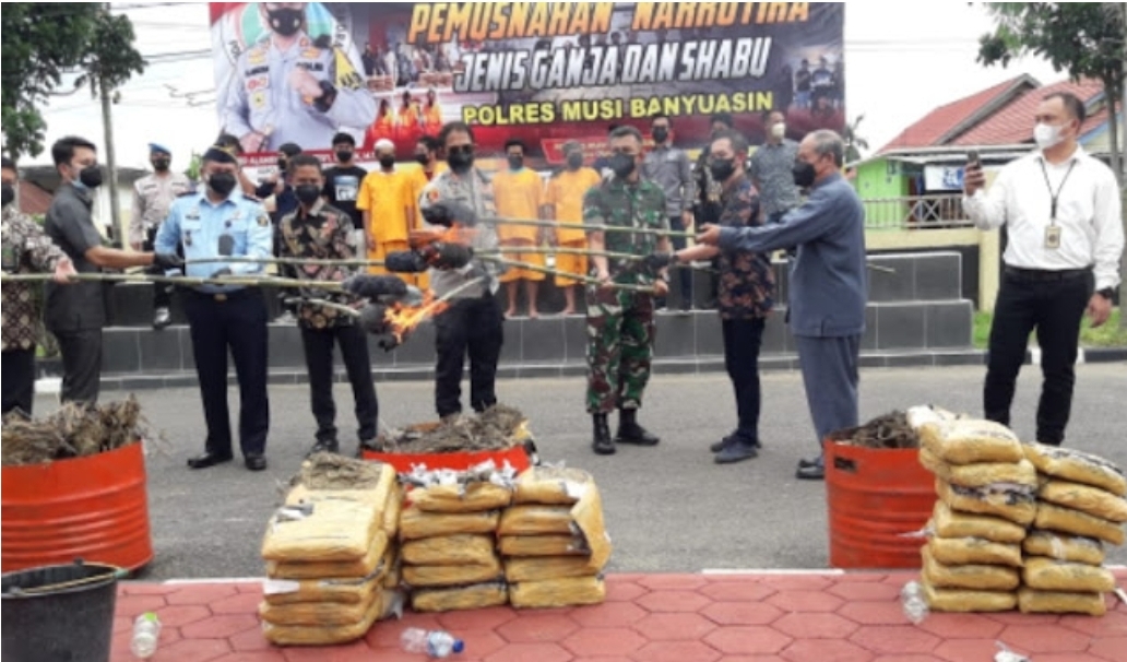 Adapun BB yang di musnahkan ; Narkotik jenis ganja sebanyak 100 kg Hasil tangkapan pada tgl 8 januari 2022 TKP Jalan Lintas palembang jambi depan polsek Bayung Lincir dengan tersangka Ferry Sandra, Amel Fahran,Andi Saputra.Sedangkan Barang bukti Sabu sabu seberat 1,7 kg hasil tangkapan pada tgl 25 pebruari 2022 TKP Dusun lV desa supat kecamatan babat supat dengan tersangka Fitralia alias Afek bin Zaini.