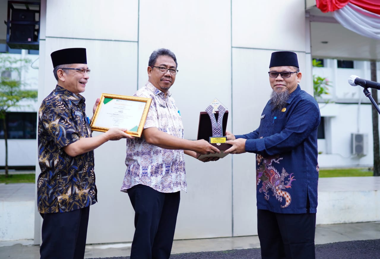 Tropi dan penghargaan ini diterima oleh Pj Sekda Musni Wijaya SSOS MSi diwakili Asisten Pemerintahan dan Kesra Setda Muba H Yudi Herzandi SH MH di Halaman Kantor Bupati saat Apel Pagi, Kamis (06/10/2022).