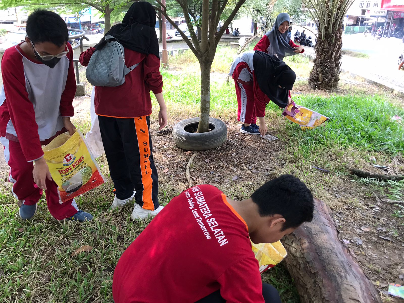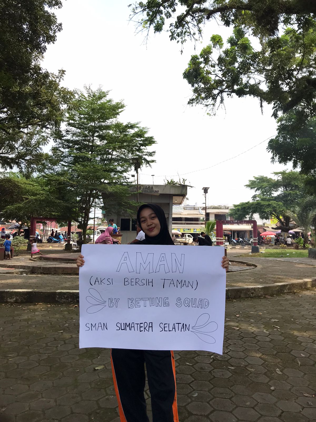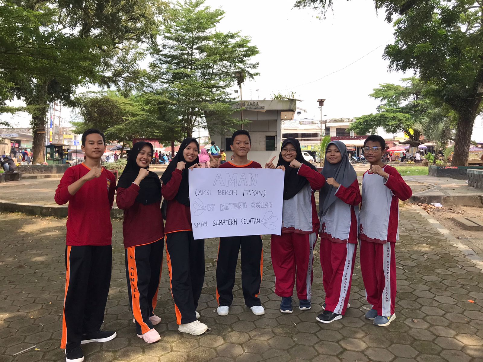 Sekelompok pelajar secara bersamaan berkumpul untuk persiapan melaksanakan kegiatan Aksi bersih taman. Kegiatan ini terselenggara berkat kerja sama para siswa- siswi SMAN Sumsel yang berasal dari kecamatan Betung dan luar dari derah kecamatan Betung dan Masyarakat disekitar Taman kota Betung.