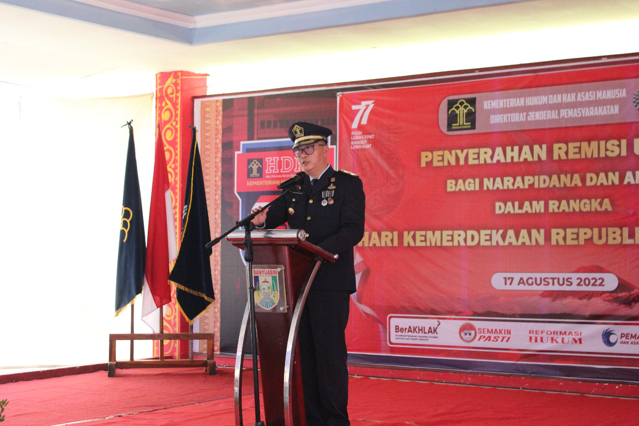 Foto: Kalapas Kelas IIA Banyuasin  Ronaldo DT, saat pembacan remisi Hut Ri ke-77 kepada 982 WBP(17/8)