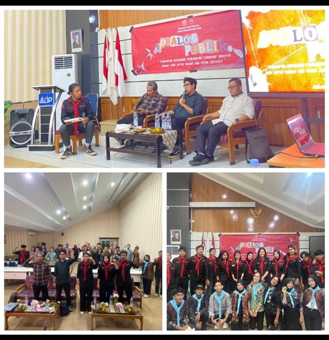 Dialog publik menghadirkan tiga narasumber: Ginda Harahap dari WALHI Jambi, Adeb Davega Prasna, S.H., M.H. selaku dosen Fakultas Hukum Universitas Jambi, serta Diomiri, S.Pd. dari Barisan Perjuangan Rakyat. Acara dipandu oleh Bojes Fadhlur Rasyid Siregar sebagai moderator dan dibuka oleh Resti Adelia Putri selaku Ketua Pelaksana.
