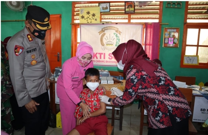 BANYUASIN, Dalam rangka percepatan vaksinasi Covid-19 di wilayah Kabupaten Banyuasin, Polres Banyuasin bersama Bhayangkari Banyuasin menggelar Vaksinasi Anak usia 6-11 tahun. Kegiatan tersebut dilaksanakan di SDN 2 Talang Kelapa, Kamis (27/01/2022).