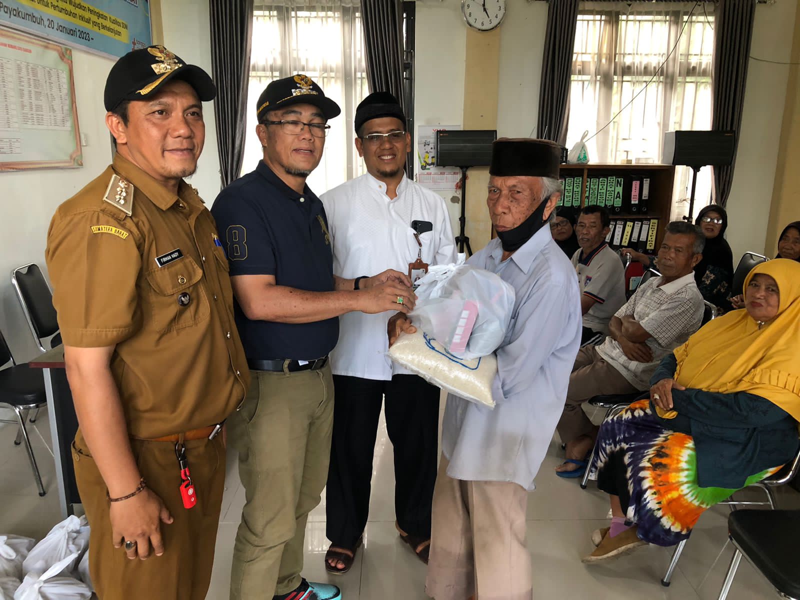 Payakumbuh — Penjabat (Pj) Walikota Payakumbuh Rida Ananda menyerahkan secara simbolis bantuan sembako kepada warga kurang mampu yang termasuk kedalam kategori rentan terdampak Stunting di kantor lurah Nunang Daya Bangun (NDB), kecamatan Payakumbuh Barat, Selasa (7/1/2023). Bantuan yang dibagikan kepada 14 KK warga di kelurahan NDB itu merupakan program dari Badan Amil Zakat Nasional (Baznas) kota Payakumbuh.