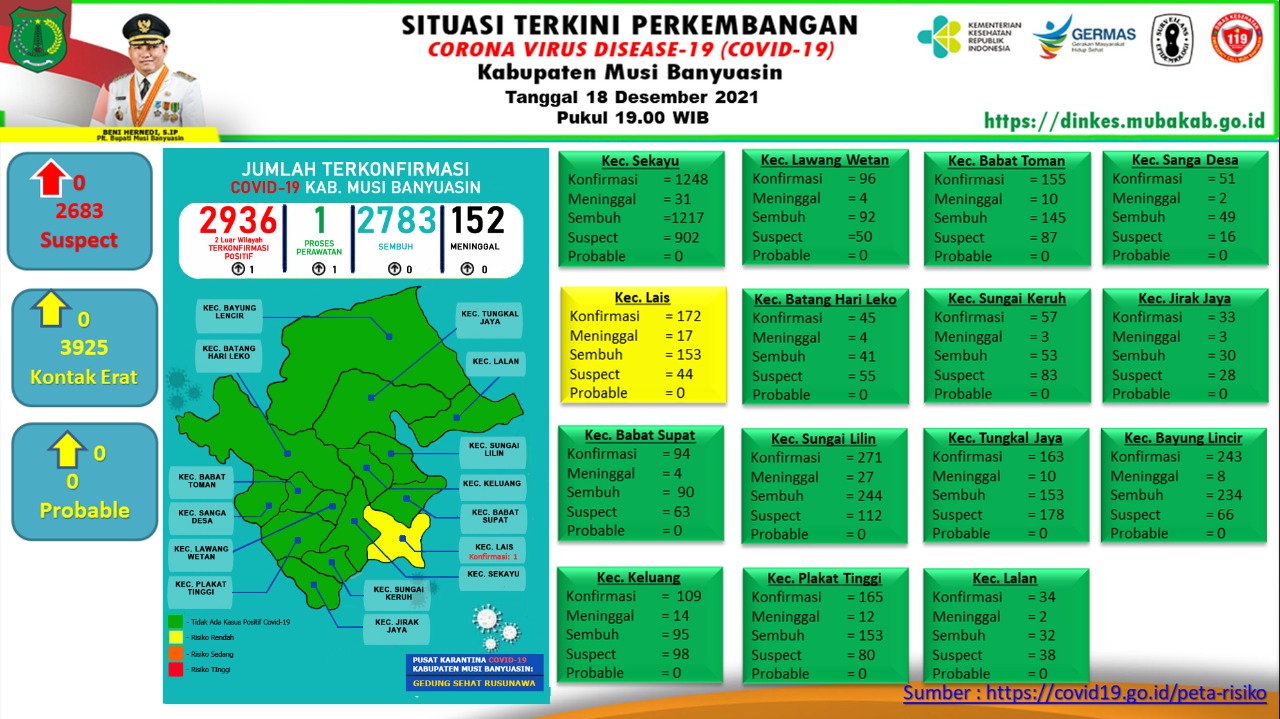 Sekayu- Gugus Tugas Penanganan COVID-19 Muba, Sabtu (18/12/2021) mengkonfirmasi 1 kasus positif.