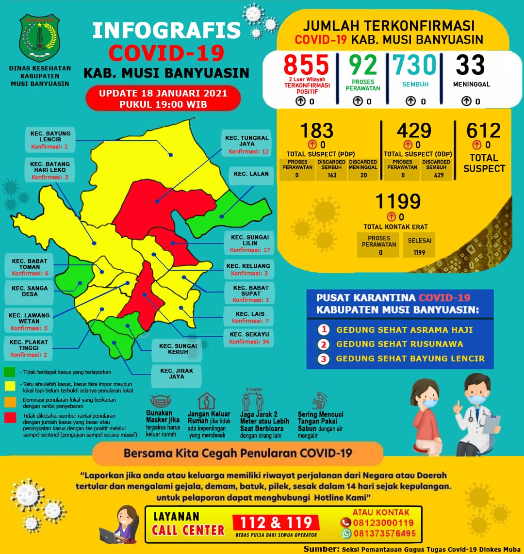 Sementara itu, berdasarkan data update Gugus Tugas Penanganan COVID-19 Muba 19 Januari 2021 tercatat ada sebanyak 429 ODP 429 selesai pemantauan 0 masih dipantau, 1.199 kontak erat 1.199 kontak selesai pemantauan 0 kontak erat yang masih dipantau, 183 PDP 0 proses pengawasan 163 selesai pengawasan.(Ray)