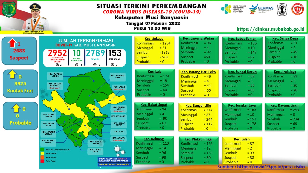 “Bertambah 2 kasus positif per 7 Februari 2022,” ungkap Jubir Gugus Tugas Penanganan COVID-19 Muba, Seftiani Peratita SS MKes.