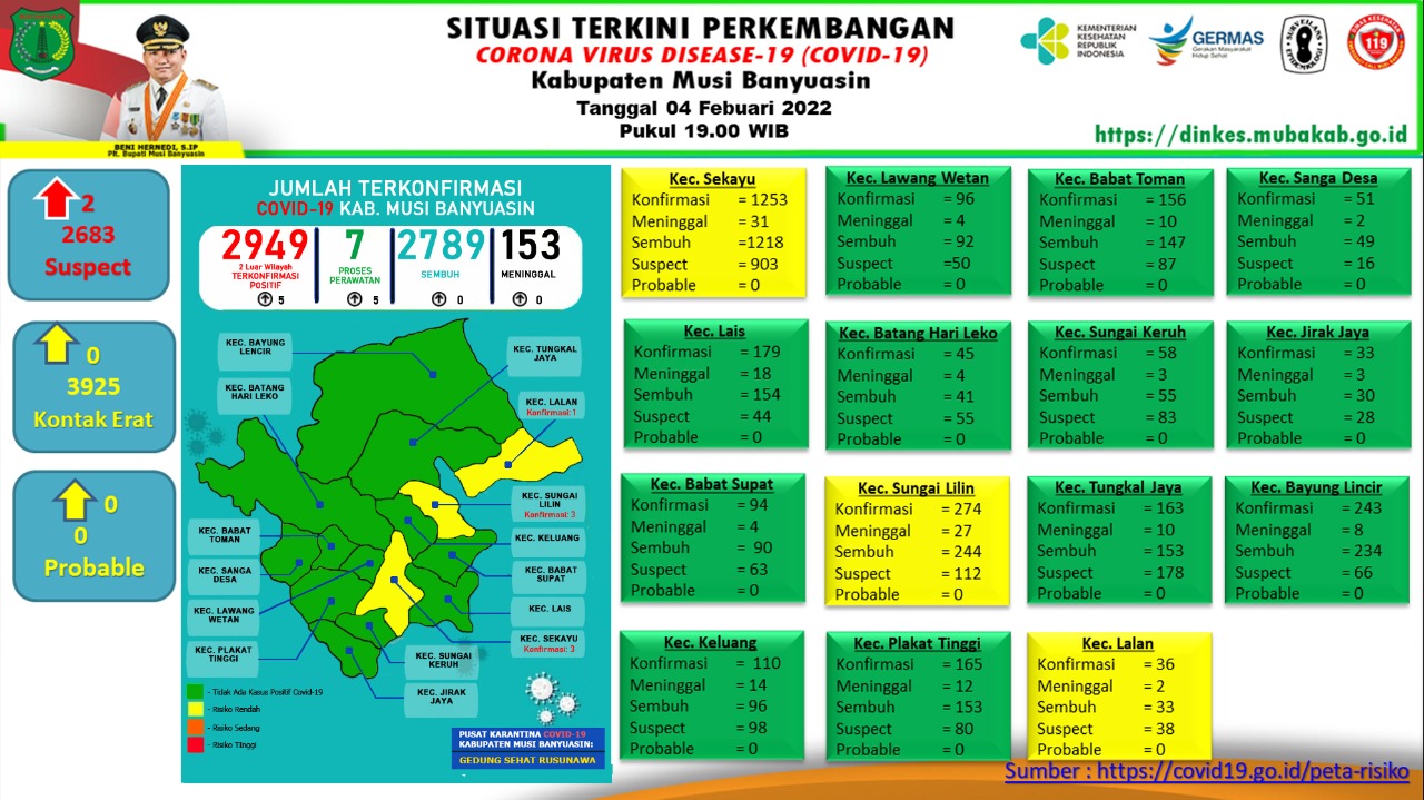 “Ada penambahan lima kasus positif per 4 Februari 2022,” ungkap Jubir Gugus Tugas Penanganan COVID-19 Muba, Seftiani Peratita SS MKes.