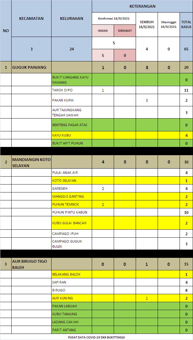 Bukittinggi.Secara umum jumlah kasus positif terkonfirmasi positif covid 19 di Bukittinggi menurun, sampai Kamis ( 16/09/2021) masih ada penambahan kasus baru sebanyak 5 orang, 4 orang di Kecamatan Kandiangi Koto Selayan( MKS )dan Kecamatan Guguk Panjang 1 orang sembuh dan selesai isolasi sebanyak 4 orang.