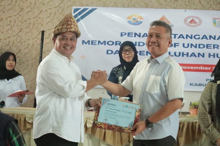 Banyuasin II – Bupati Banyuasin, Dr. H. Askolani, SH., MH didampingi oleh Kepala Dinas Pendidikan dan Kebudayaan Banyuasin, Dra. Yosi Zartini, MM resmi membuka Penyuluhan Hukum pada Penandatanganan Memorandum Of Understanding antara Universitas IBA dengan Pemerintah Kabupaten Banyuasin dan Pemerintah Kecamatan digelar di Ruangan Kelas SMPN I Banyuasin II, Rabu (12/11/2025).