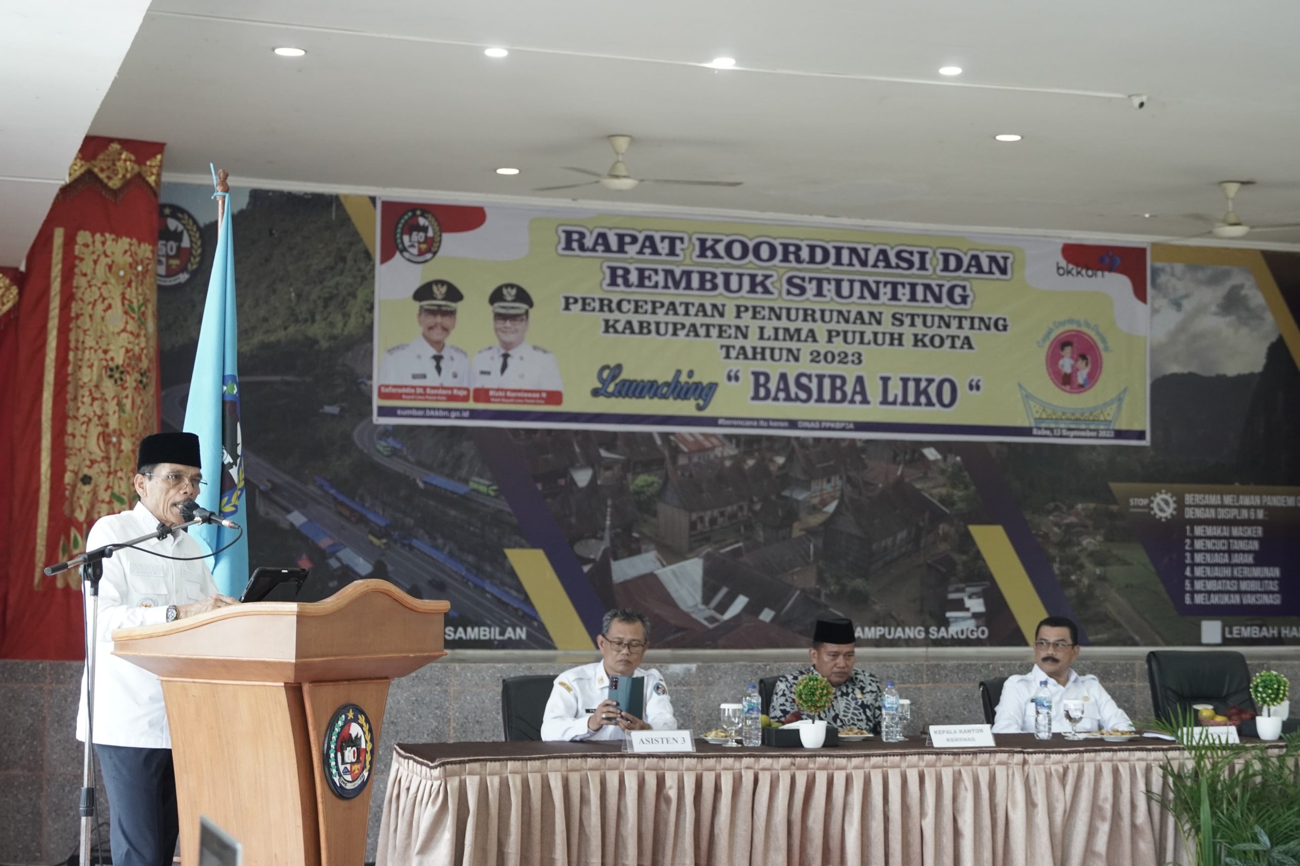 Bupati Limapuluh Kota, Safaruddin Dt. Bandaro Rajo membuka acara rapat koordinasi dan rembuk Stunting tingkat Kabupaten Limapuluh Kota sekaligus launching BASIBA LIKO (Bersama Atasi Stunting dengan Ibu Bapak Asuh Lima Puluh Kota) di Aula Kantor Bupati Limapuluh Kota, Sarilamak, Rabu (13/09/2023).