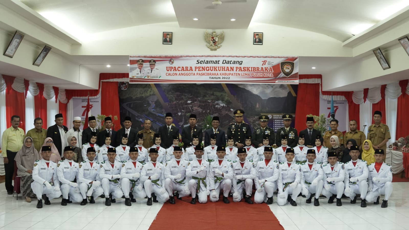 Limapuluh Kota, – Mengawali rangkaian resmi Peringatan Hari Ulang Tahun ke-77 Kemerdekaan Republik Indonesia Tahun 2022 di Kabupaten Lima Puluh Kota, Bupati Safaruddin Dt. Bandaro Rajo mengukuhkan 28 Pasukan Pengibar Bendera Pusaka (Paskibraka) di Aula Kantor Bupati Lima Puluh Kota, Sarilamak pada Senin (15/08/2022).