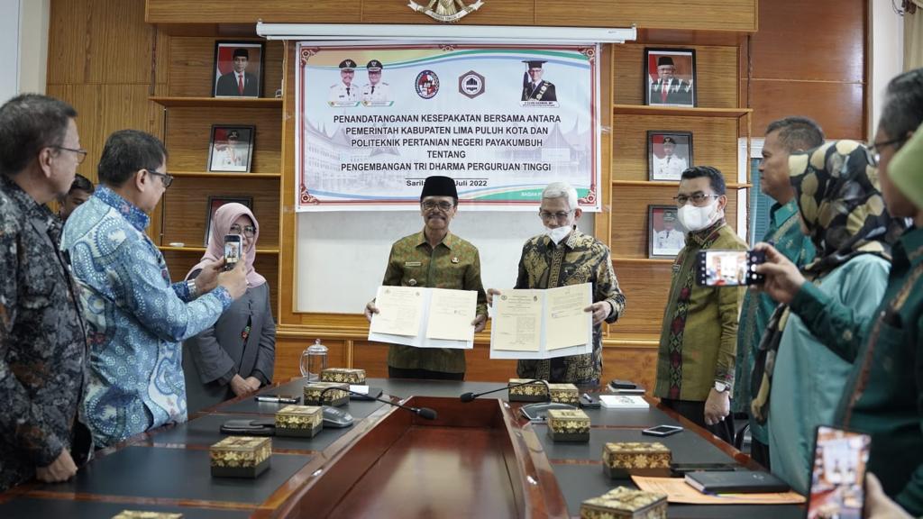 Ajakan itu disampaikan Bupati Safaruddin dalam rangkaian acara penandatangan perpanjangan Naskah Nota Kesepahaman / MoU antara Pemerintah Kabupaten Limapuluh Kota dengan Politani Payakumbuh, di Ruang Rapat Bupati Limapuluh Kota di Sarilamak, Harau (07/07/2022).
