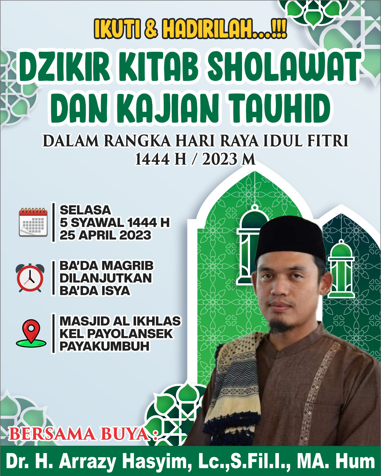 Payolansek -Pengurus Masjid Al-Ikhlas Payolansek bekerjasama dengan pihak terkait ,LPM Kelurahan Payolansek Kecamatan Payakumbuh Barat Kota Payakumbuh Besok Hari Selasa 25 April 2023 M bertepatan 04 Syawal 1444 H menggelar Dzikir Kitab Sholawat dan Kajian Tauhid.