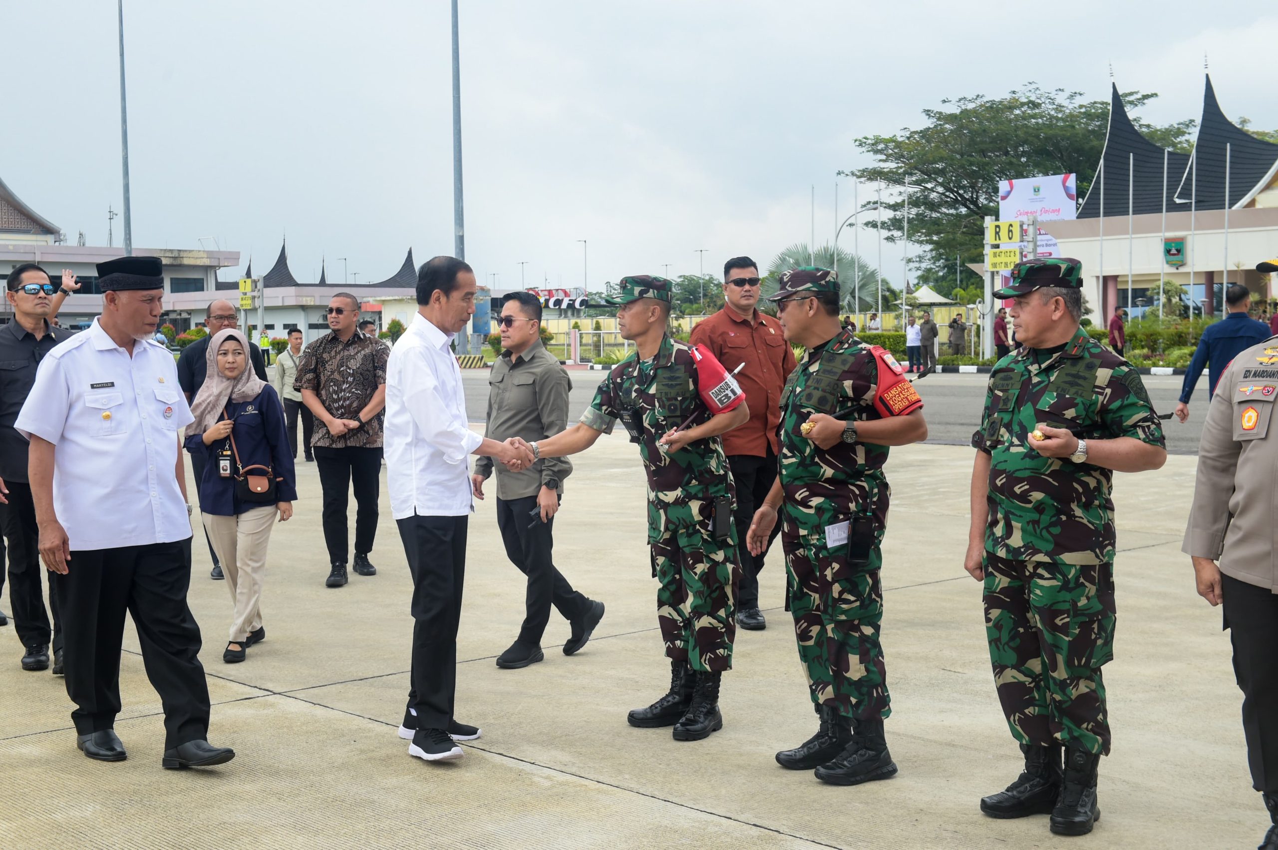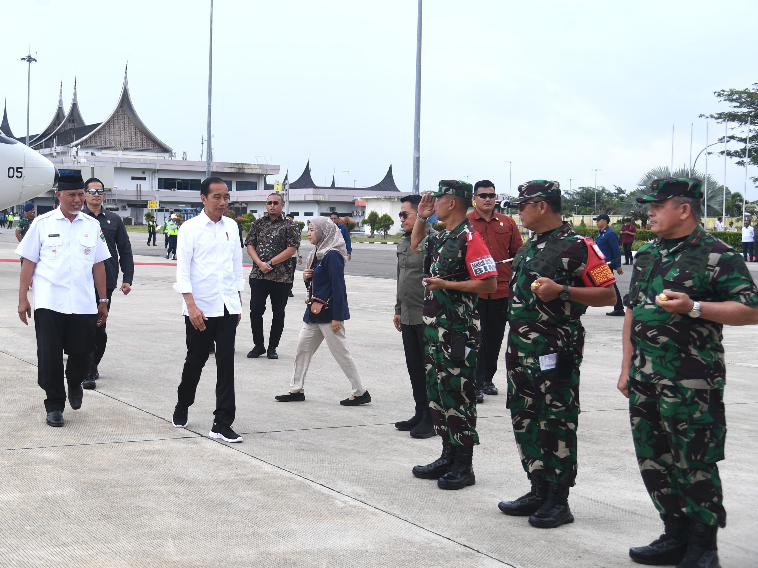 Padang –TNI AU – LANUD SUT. Komandan Lanud Sutan Sjahrir Kolonel Nav Saeful Rakhmat menyambut kedatangan Presiden RI Ir. H. Joko Widodo beserta rombongan dengan menggunakan pesawat Kepresidenan RI milik TNI-AU, Type B-737-400 Nomor Registrasi A-7305 bertempat di VIP Bandara Internasional Minangkabau, Padang, Rabu, (25/10/2023).