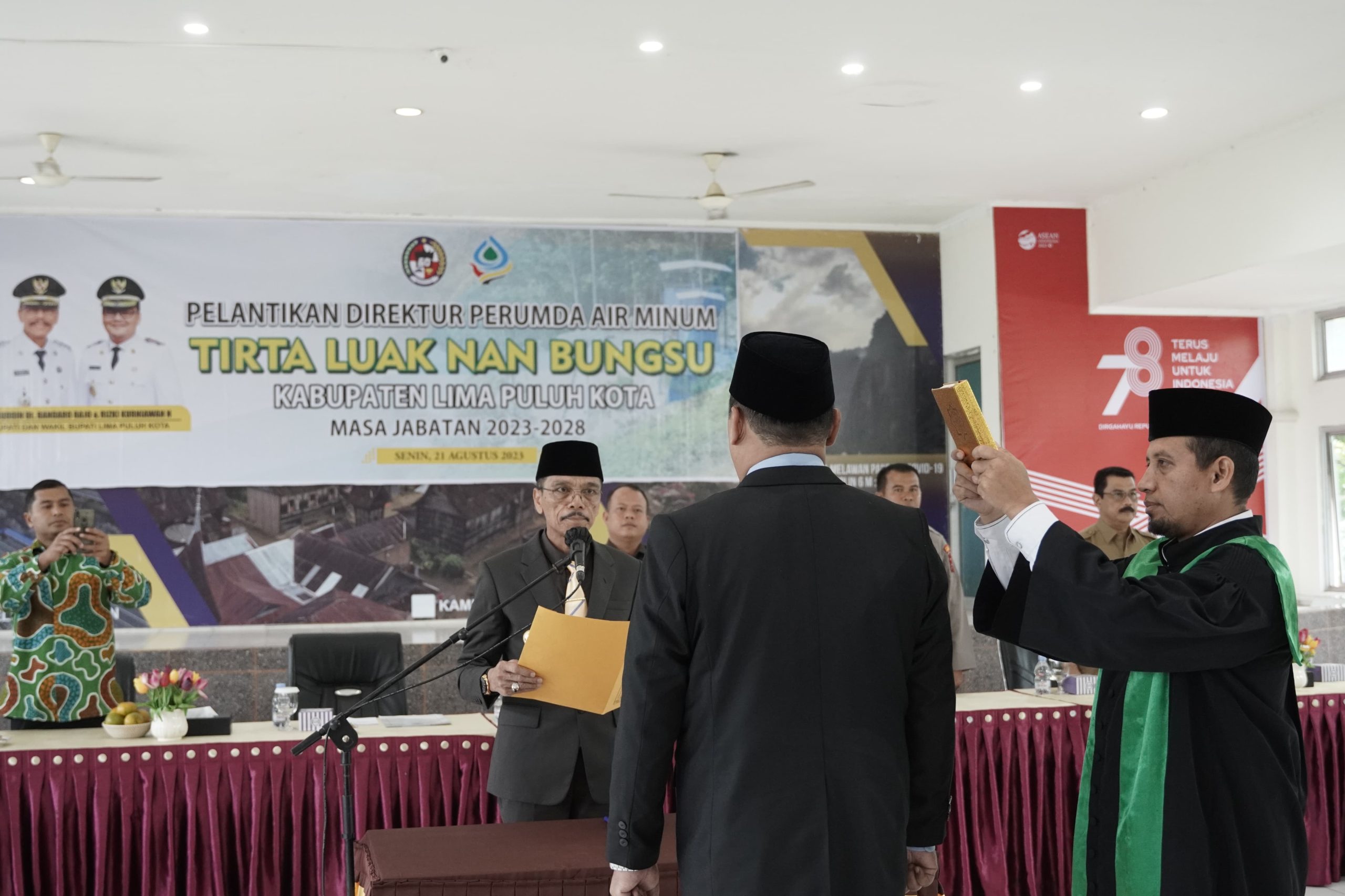 Limapuluh Kota, — Dilantiknya Direktur Utama Perusahaan Umum Daerah Air Minum (PDAM) Tirta Luak Nan Bungsu  diharapkan mampu membawa perubahan lebih baik dengan mengoptimalkan seluruh potensi yang ada guna peningkatan kinerja perusahaan, karena Perumda Air Minum ini didirikan untuk memenuhi kebutuhan masyarakat akan air bersih serta mendorong perkembangan perekonomian daerah dan juga dapat memberikan kontribusi pada pendapatan asli daerah. Hal demikian disampaikan Bupati Limapuluh Kota H.Safaruddin Dt.Bandaro Rajo sesaat setelah melantik Nofrizen sebagai Direktur PDAM Tirta Luak Nan Bungsu Kabupaten Limapuluh Kota periode 2023-2028. Setelah melalui sejumlah tahapan seleksi, prosesi pelantikan dilakukan di Aula Kantor Bupati, Sarilamak, Senin, (21/08/2023).