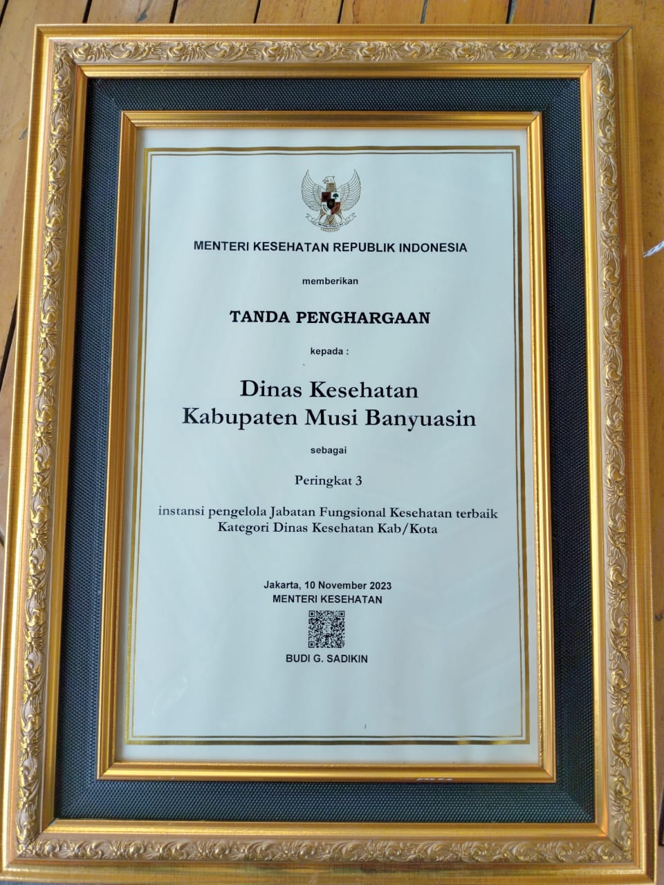 MUBA,- Prestasi luar biasa, Dinas Kesehatan Kabupaten Musi Banyuasin satu satunya Kabupaten di luar pulau Jawa yang berhasil meraih penghargaan peringkat III Jabatan Fungsional Kesehatan (JFK) terbaik Katagori Dinas kesehatan Kabupaten/kota tahun 2023.