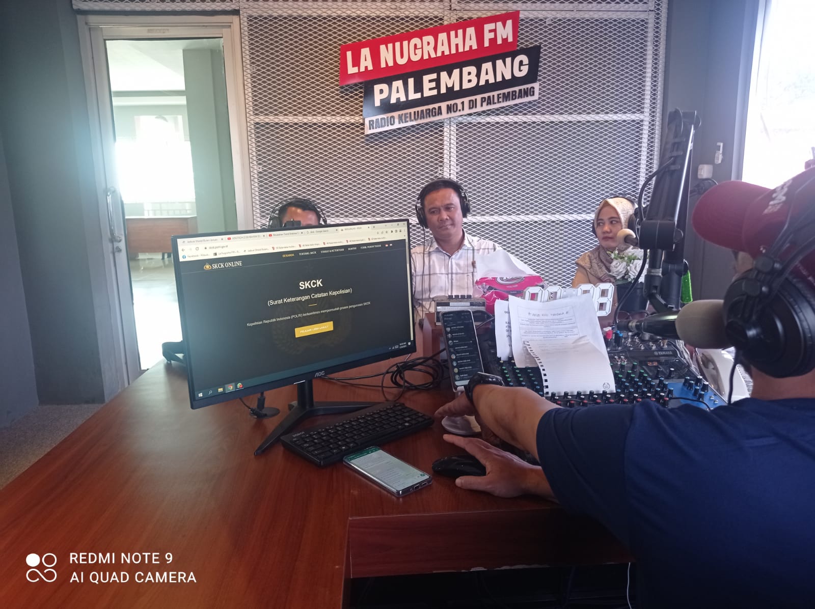PALEMBANG Direktorat Intelkam Polda Sumsel mengadakan sosialisasi terkait pendaftaran Surat Keterangan Catatan Kepolisian (SKCK) Online kepada masyarakat lewat Talk Show di Radio Lanugraha FM Palembang ,selasa (24/1/2023).