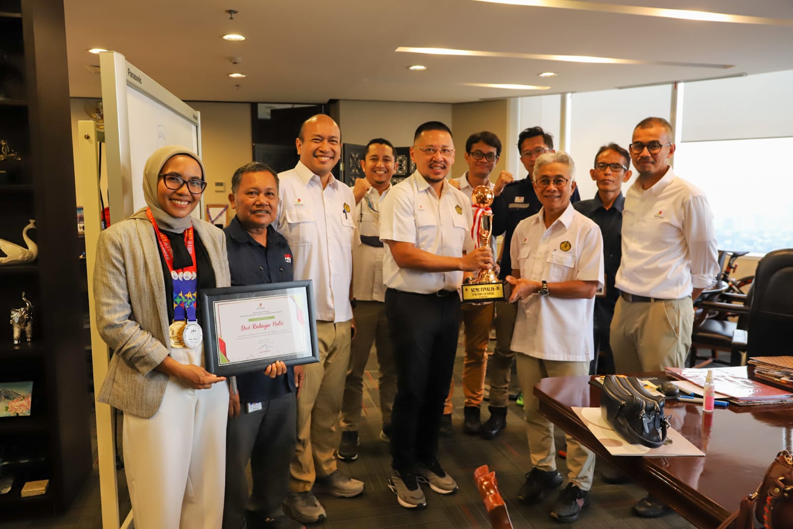 PALEMBANG, – Kepala SKK Migas, Dwi Setjipto memberikan apresiasi atas prestasi yang diraih oleh Dwi Rahayu Pitri (Sekretariat Kelompok Kerja Operasi TI SKK Migas), atas prestasinya meraih mendali Emas SEA Games di Phnom Penh, Kamboja, dalam cabang olahraga Soft Tenis tunggal putri.