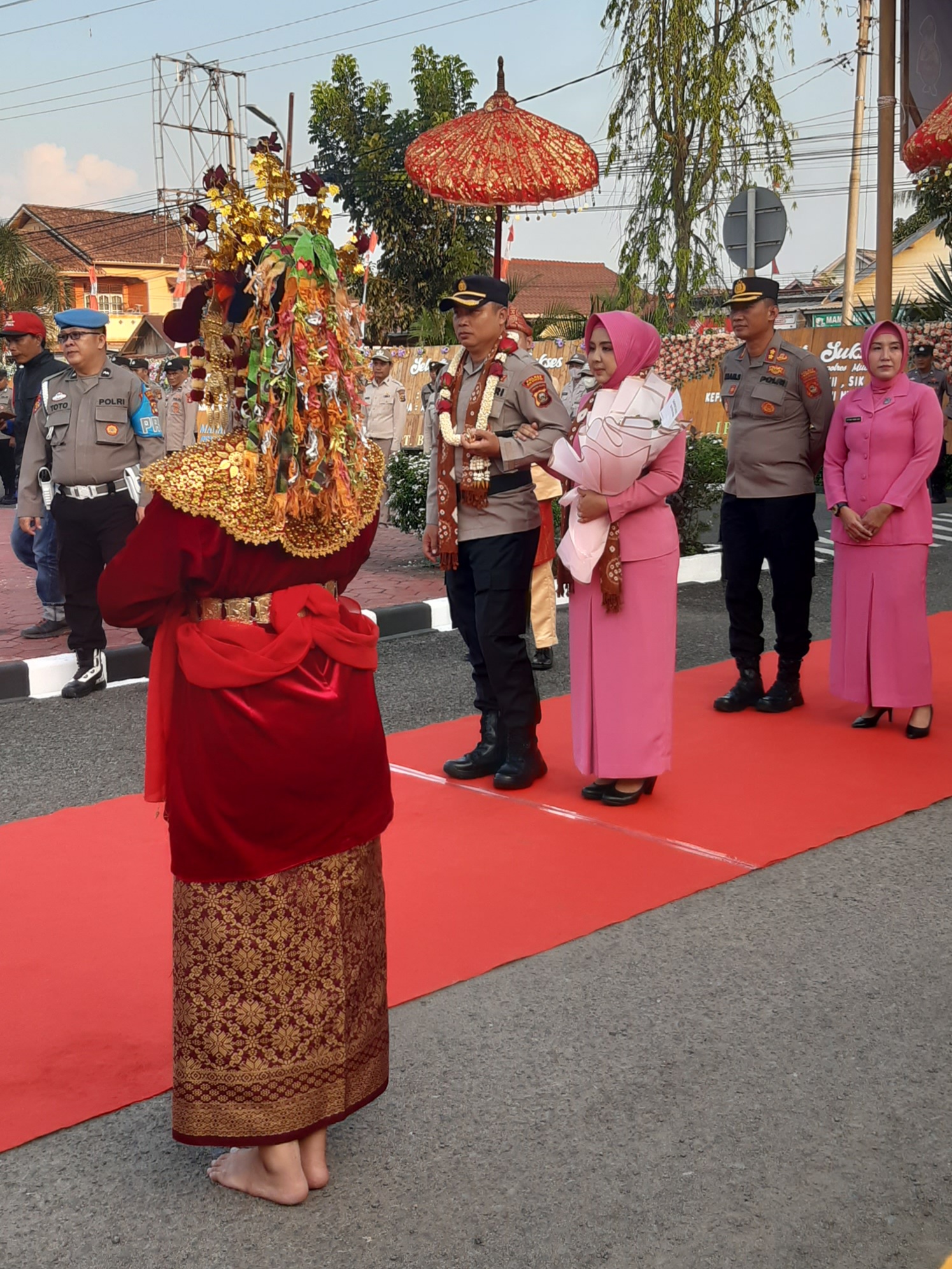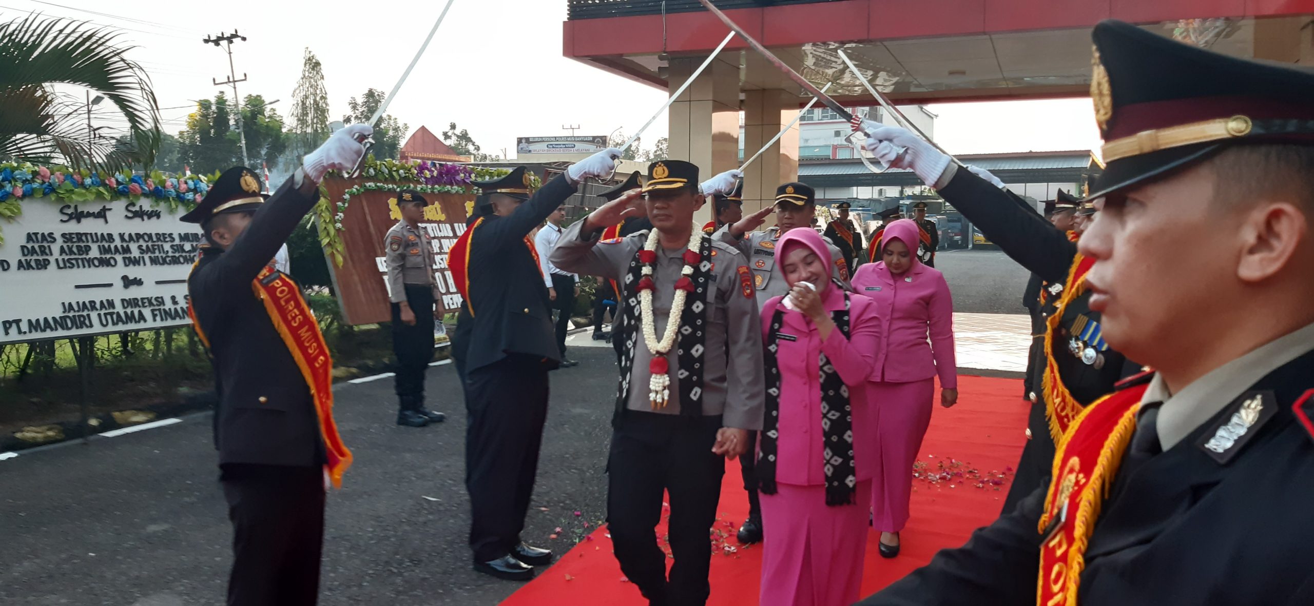 Penerimaan Kapolres Muba yang baru AKBP AKBP Listiyono Dwi Nugroho, SIK, MH diawali dengan pengalungan bunga kemudian tradisi gerbang pora yang dilanjutkan dengan laporan kesatuan.