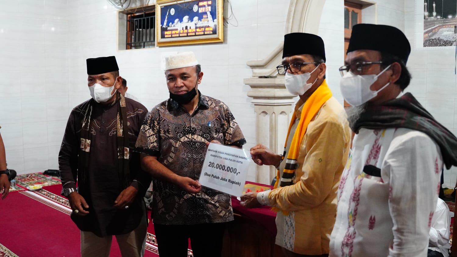 Di kesempatan itu, Bupati Safaruddin juga mengingatkan masyarakat untuk berpacu meningkatkan keimanan dan amal ibadah selama bulan suci ramadhan ini dan tidak lupa untuk tetap menjaga diri dari berbagai macam penyakit salah satunya dari ancaman virus covid-19. Usai melaksanakan sholat tarawih berjemaah Bupati Safaruddin menyerahkan bantuan uang tunai sebesar 20 juta rupiah yang diterima oleh pengurus Masjid Istiqomah.