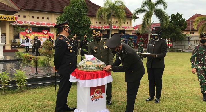 Kapolres Mura, AKBP Efrannedy beserta personel Polres Mura, menerima pemberian tumpeng dari, Dandim 0406 Lubuklinggau, Letkol Inf Erwinsyah Taupan.