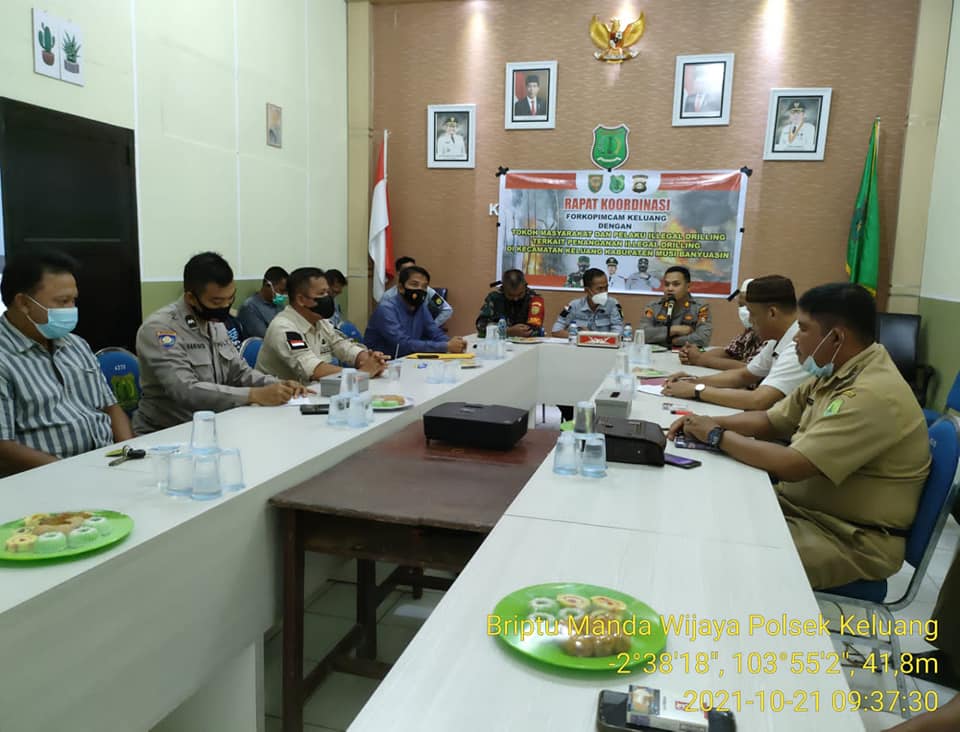 untuk memaksimalkan penertiban kegiatan illegal drilling tersebut, hari ini forkopimcam keluang yang terdiri dari camat, kapolsek dan danramil mengadakan rapat Forkopimcam Keluang dengan Tokoh Masyarakat dan Pelaku illegal Drilling terkait Penanganan Illegal Drilling di Kecamatan Keluang yang dilaksanakan di ruang pertemuan Camat Keluang Kab. Muba, Kamis (21/10/21)