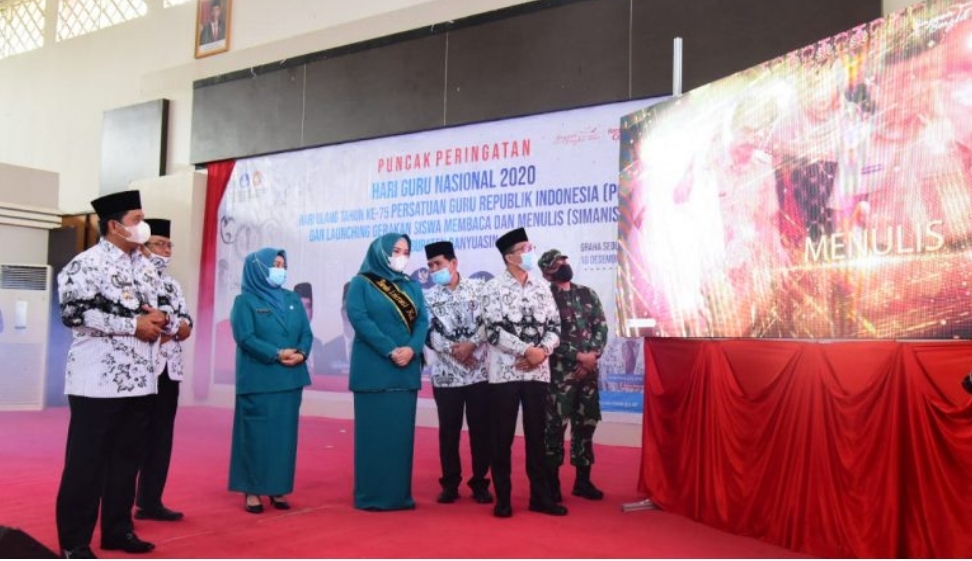 HEADLINESRIWIJAYA.COM. BANYUASIN. – Peringatan Puncak Hari Guru Nasional dan Hari Ulang Tahun ke-75 sekaligus Launching Gerakan Siswa Membaca dan Menulis (Si Manis) Kabupaten Banyuasin berlangsung di Graha Sedulang Setudung.