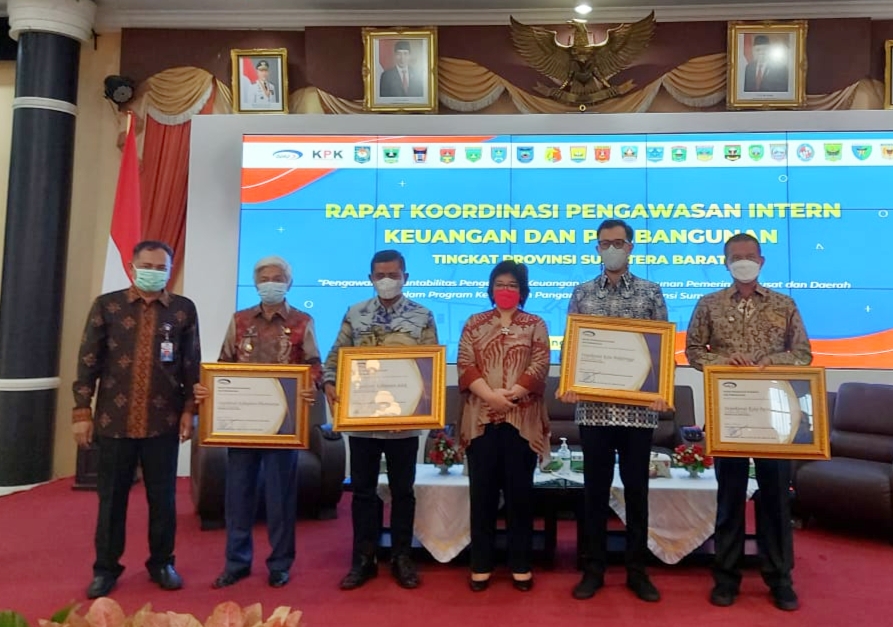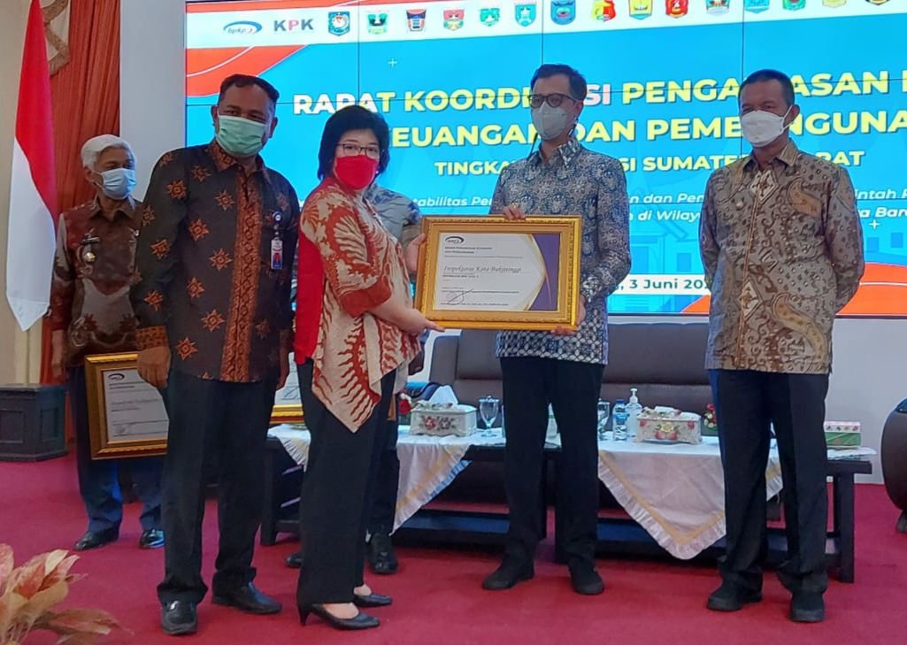 Penghargaan tersebut diterima langsung oleh Walikota Bukittinggi H.Erman Safar, SH dari Deputi Kepala BPKP Bidang Investigasi Agustina Arumsari, AK.,MH.,CFE.,CFrA.,CA.,QIA.,CGCAE dalam acara Rapat Koordinasi Pengawasan Intern Keuangan dan Pembangunan Tingkat Provinsi Sumatera Barat yang bertemakan ‘Mengawal Akuntabilitas Keuangan dan Pembangunan Daerah’ digelar di Auditorium Gubernuran Sumatera Barat Jalan Jend.Sudirman Padang, Kamis (3/6).