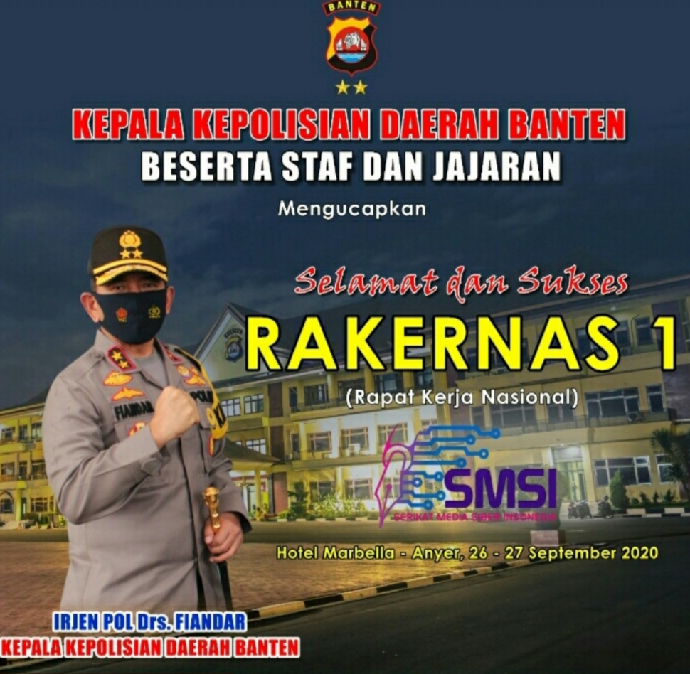 Saya atas nama Kepala Kepolisian Daerah Banten mengucapkan selamat dan sukses kepada Serikat Media Siber Indonesia (SMSI) atas terlaksananya Rapat Kerja Nasional yang ke 1, yang dimana Rakernas kali ini Provinsi Banten terpilih menjadi tuan rumahnya,” ujar Fiandar. Minggu, (27/9/2020).