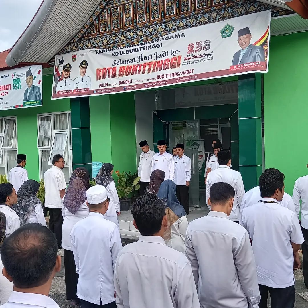 Bukittinggi, –Kakan Kemenagi, H. Eri Iswandi pimpin Apel pagi di lingkungan Kantor Kementerian Agama Kota Bukittinggi Senin (6/2) bertempat di halaman Kantor setempat.