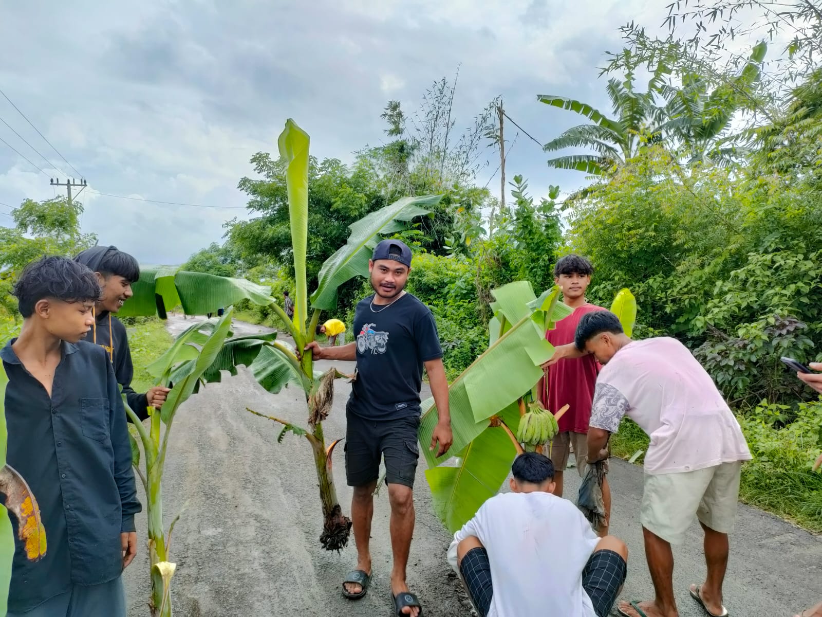 LOTIM.Puluhan warga dari dua desa di wilayah kecamatan Jerowaru yakni Desa Pemongkong dan Serewe melakukan aksi tanam pohon pisang di jalan kabupaten jurusan Desa Pemongkong-Serewe,Selasa (07|2).