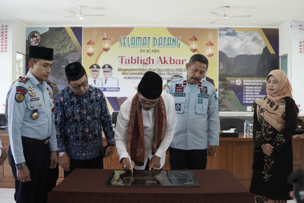 Lima Puluh Kota, — Bupati Limapuluh Kota Safaruddin Dt.Bandaro Rajo bersama Kepala Kantor Wilayah (Kanwil) Kementerian Hukum dan HAM (Kemenkumham) Sumatera Barat Haris Sukamto meresmikan Lapas Suliki sebagai Lapas berbasis pesantren pertama di Sumatera Barat. Diselenggarakan di Aula Kantor Bupati, Sarilamak, (06/03/2023), peresmian Lapas berbasis pesantren dilangsungkan pada acara Tabligh Akbar dalam rangka menyambut bulan suci Ramadhan 1444 H disertakan Launching 10 program unggulan Pemerintah Kabupaten Limapuluh Kota. Lapas berbasis pesantren sendiri merupakan suatu program penguatan kepada warga binaan dalam memperdalam ilmu agama layaknya santri yang sehari-hari menuntut ilmu di Pondok Pesantren. Turut hadir dalam peresmian, Gubernur Sumatera Barat yang diwakili Staf Ahli Bidang Politik, Hukum, dan Pemerintahan Jasman Rizal, Ketua DPRD Limapuluh Kota Deni Asra beserta unsur Forkopimda, Kepala Kantor Kemenag Irwan, Kalapas Suliki Kamesworo, Kepala LPKA Tanjung Pati Sahduriman, Ketua BAZNAS Limapuluh Kota Yulius dan Ketua TP PKK Nevi Safaruddin. Tabligh Akbar yang diikuti oleh sejumlah Kepala Perangkat Daerah di Kabupaten Limapuluh Kota juga diisi dengan Tausiyah agama oleh Ustad Zulfahmi Malin Mudo dan dirangkai dengan sejumlah MoU antara Kemenag Limapuluh Kota, Lapas Suliki, LPKA Tanjung Pati, BAZNAS serta BKMT Limapuluh Kota.