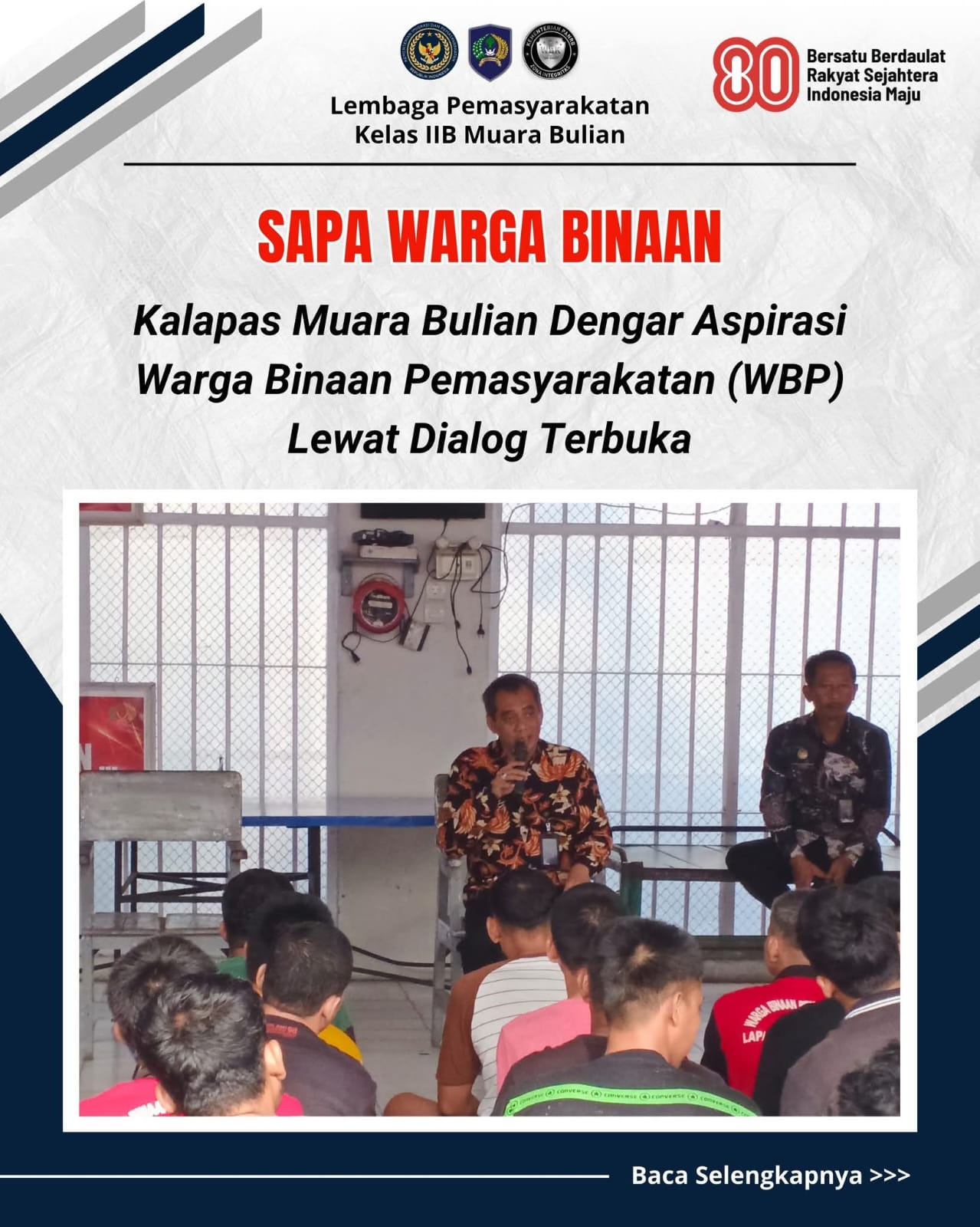 Muara Bulian, 15 Agustus 2025 – Lembaga Pemasyarakatan (Lapas) Kelas IIB Muara Bulian menggelar kegiatan dialog terbuka antara Kalapas Muara Bulian, M. Ilham Santoso Sahdani dan Warga Binaan Pemasyarakatan (WBP) di area blok hunian, Jumat (15/08). Kegiatan ini menjadi ajang komunikasi langsung yang rutin dilakukan untuk menyerap aspirasi, menyampaikan informasi penting, sekaligus memastikan seluruh layanan di Lapas berjalan secara transparan, akuntabel, dan bebas pungutan liar.