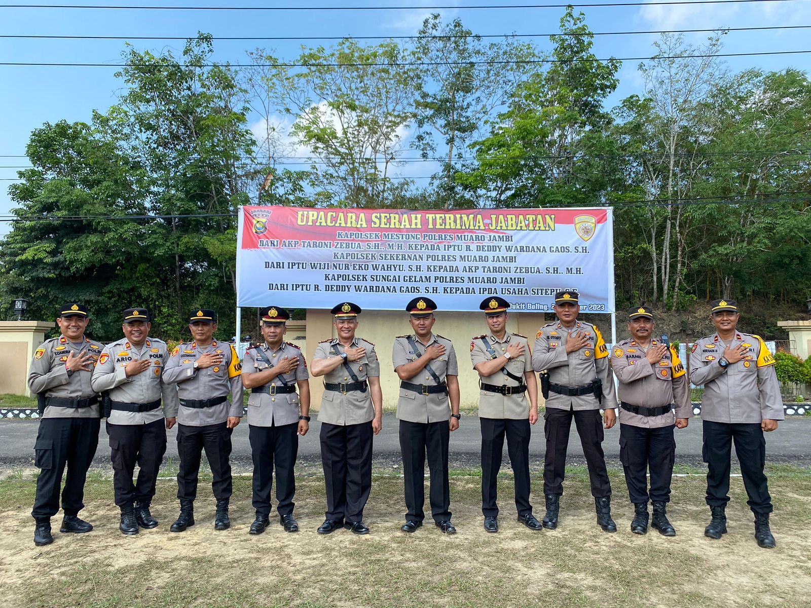 Jambi – Kapolres Muaro Jambi AKBP Muharman Arta,S.I.K , Pimpin Kegiatan Upacara Serah Terima Jabatan Kapolsek Mestong Polres Muaro Jambi dari AKP Taroni Zebua,S.H, M.H., Kepada IPTU R Dedi Wardana Gaos,S.H., dan Kapolsek Sekernan Polres Muaro Jambi dari IPTU Wiji Nur Eko Wahyu,S.H Kepada AKP Taroni Zebua S.H,M.H, Kapolsek Sungai Gelam Polres Muaro Jambi dari IPTU R Dedi