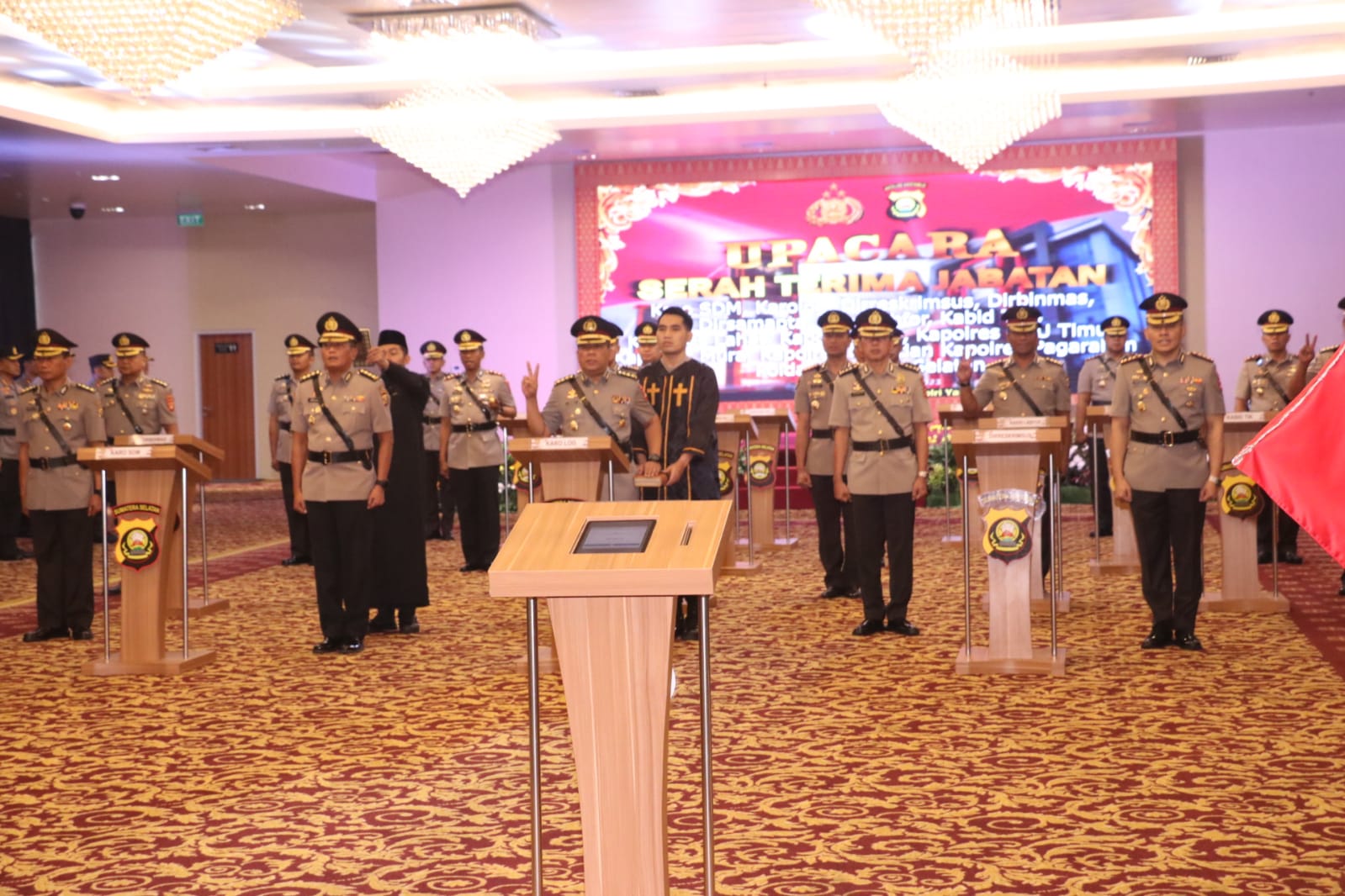 PALEMBANG – Kapolda Sumsel, Irjen Pol A.Rachmad Wibowo SIK , memimpin upacara Serah Terima Jabatan (Sertijab) PJU dan Kapolres jajaran Polda Sumsel, diruang Auditorium Gedung Utama Presisi Lantai 7  Mapolda Sumsel Palembang, Kamis (12/01/2023).
