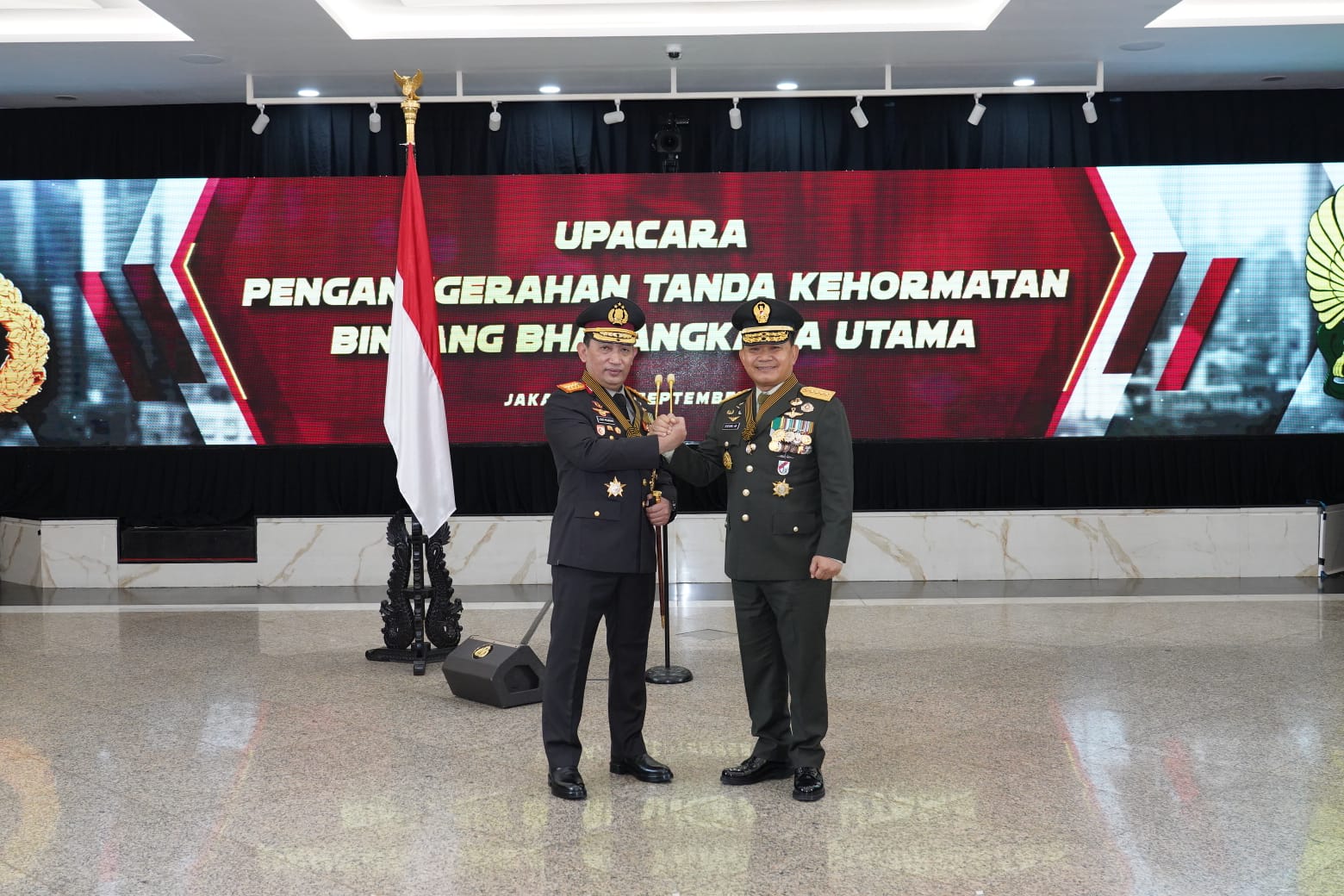 JAKARTA -tniad.mil.id, Kepala Staf Angkatan Darat Jenderal TNI Dr. Dudung Abdurachman menerima penganugerahan tanda kehormatan Bintang Bhayangkara Utama dari Kepolisian Republik Indonesia (Polri), yang diserahkan oleh Kapolri Jenderal Polisi Listyo Sigit Prabowo bertempat di Ruang Rapat Utama Mabes Polri Jakarta Selatan, Senin (12/9/2022).