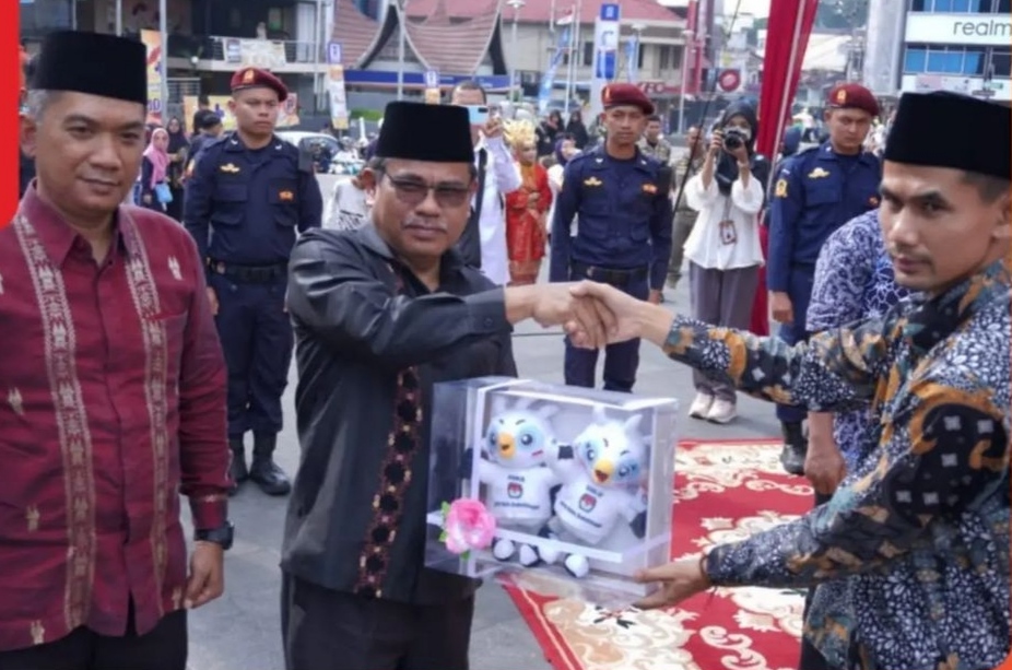 Bukittinggi –Estafet perjalanan Kirab Pemilu Tahun 2024 jalur I Sumatra, tiba di Kota Bukittinggi. Kedatangan kirab tersebut ditandai dengan prosesi serah terima dari Komisi Pemilihan Umum (KPU) Kota Payakumbuh kepada KPU Kota Bukittinggi, di Pelataran Jam Gadang, Kamis (22/06/ 2023.)