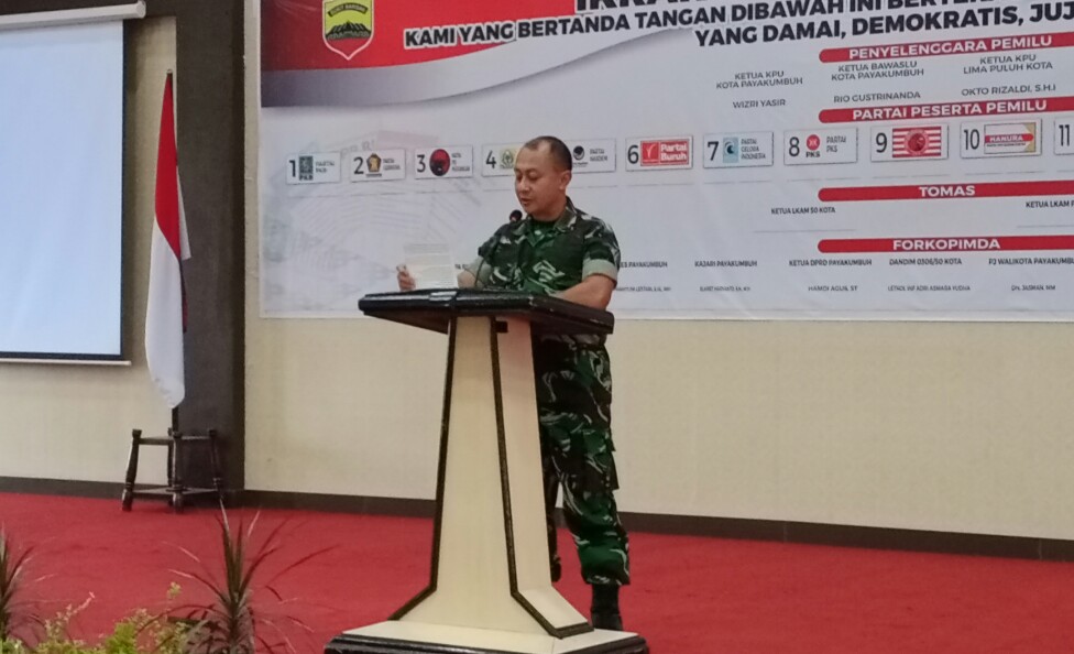Komandan Kodim (Dandim) 0306/50 Kota Letkol Inf Adri Asmara Yudha dalam kesempatannya mengatakan, deklarasi Pemilu Damai merupakan komitmen seluruh elemen masyarakat dalam menunjukkan kedewasaan berpolitik maupun berdemokrasi.