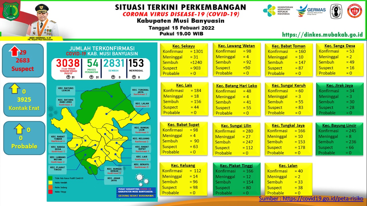 “Ada penambahan 31 kasus positif COVID-19 per 15 Februari 2022,” ungkap Jubir Gugus Tugas Penanganan COVID-19 Muba, Seftiani Peratita SS MKes.