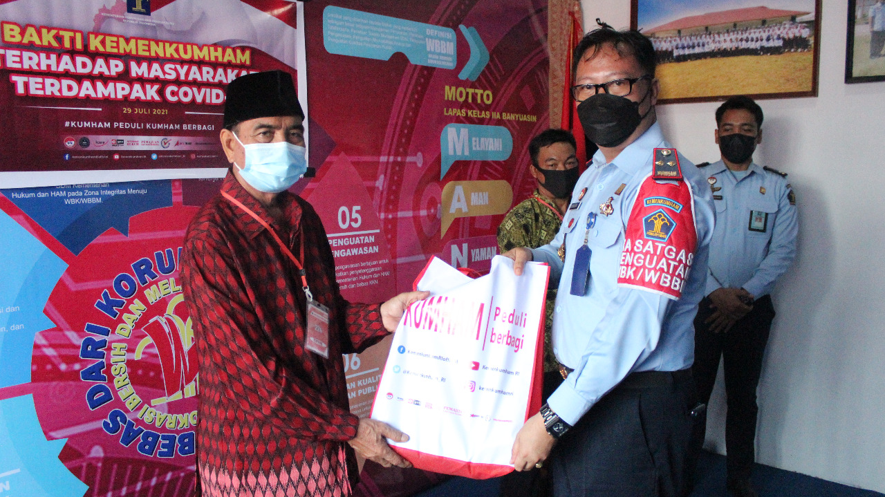 Lapas Kelas IIA Banyuasin, turut berpartisipasi mengeluarkan bantuan sosial, yang bertemakan Kumham Peduli Kumham – Berbagi. Kamis (29/07/2021). Sebanyak 100 paket sembako disalurkan pihak Lapas Banyuasin kepada masyarakat sekitar. bantuan tersebut berasal dari penggalangan dana dari seluruh pegawai Lapas Banyuasin.