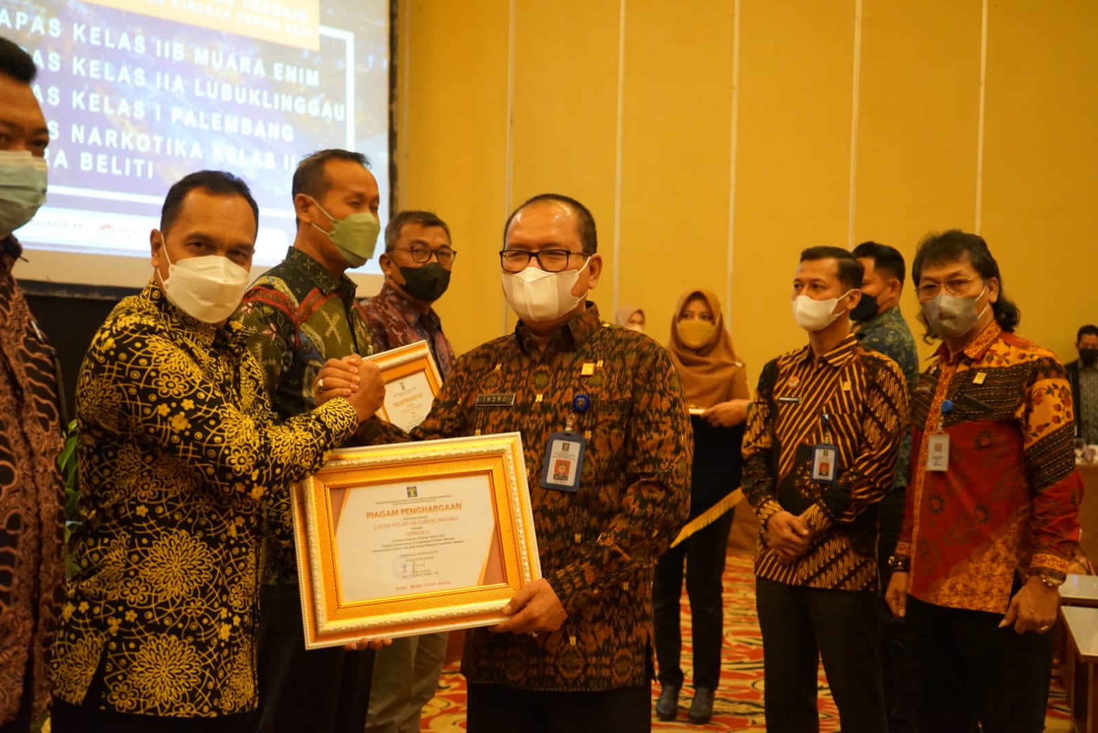 Palembang- Lapas Kelas IIA Lubuklinggau Kantor Wilayah Kemenkumham Sumatera Selatan Kembali menerima penghargaan terbaik II dalam kegiatan Rapat Kordinasi dan Evaluasi Capaian Kinerja Tahun 2021 Satuab Kerja dilingkungan Kantor Wilayah Kemenkumham Sumatera Selatan yang dilaksanakan mulai dari tanggal 24 Februari 2022, Sabtu (26/2).