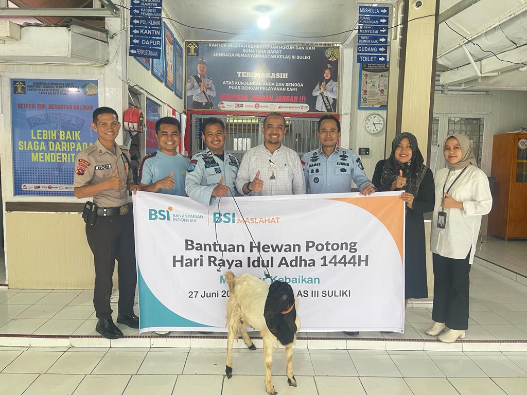 Bantuan berupa 30 Alqur’an terjemahan dilengkapi tajwid dan 1 ekor kambing untuk Qurban di Hari Raya Idul Adha 1444 Hijriah, Pemberian secara simbolis oleh Brach Manager BSI KCP Pangkalan Tj Pati, Armi Chandra Budiman kepada Kepala Lapas Suliki, Kamesworo di Halaman Lapas Suliki.