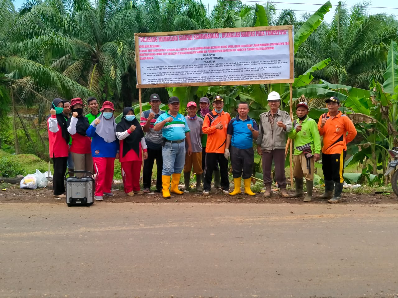 Plang tersebut dipasang di pinggir jalan, tepatnya di jalan Betung – Sekayu depan areal Afling 4 PTPN 7 unit Betung yang sudah lama oleh warga jadi tempat buang sampah.