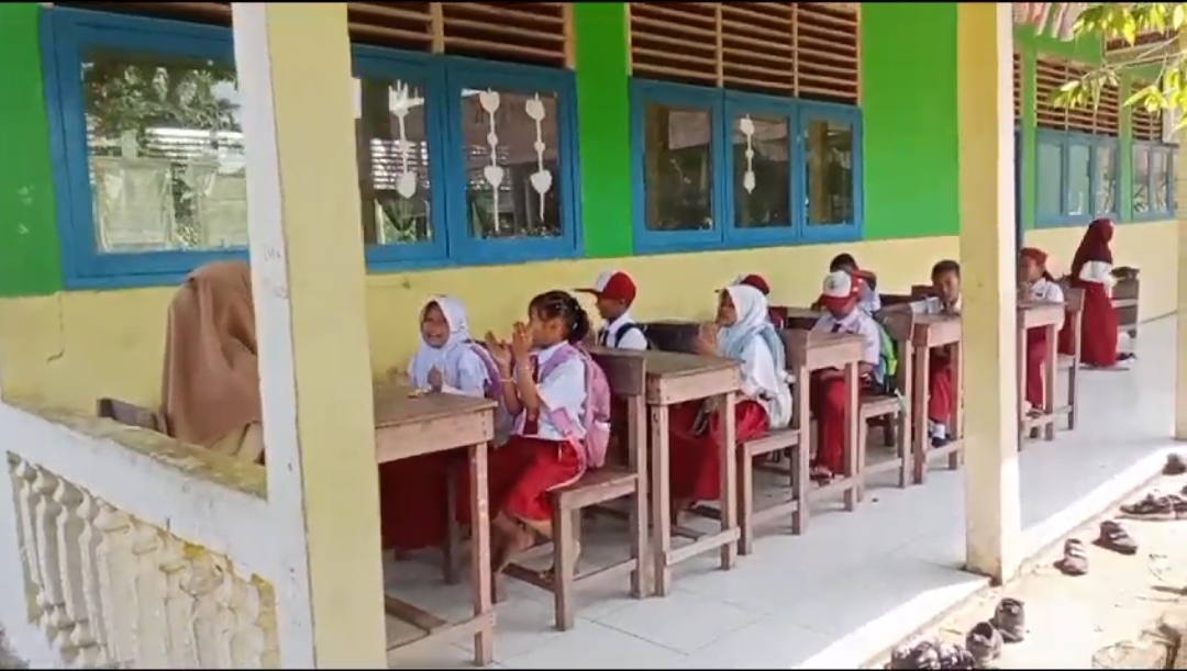 Miris Masih Ada Sekolah SD Negeri di Muba  Siswanya Belajar di Teras Sekolah, ini Alasan Kepseknya.