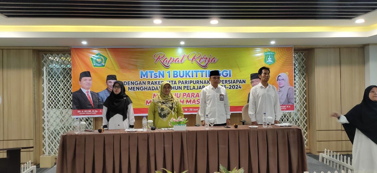 Bukittinggi—Dalam rangka persiapan tahun pelajaran 2023/2024, MTs N 1 Bukittinggi melaksanakan Rapat Kerja (Raker) guna memantapkan program kerja madrasah yang diadakan selama dua hari, mulai dari tanggal 19 dan 20 Juni 2023, di Ballrom Hotel Grand Bunda Bukittinggi. Raker diikuti seluruh GTK MTsN 1 Bukittinggi. Tema yang diusung dalam Raker yaitu “Paripurnakan Persiapan Menghadapi Tahun Pelajaran 2023/2024 Menuju Madrasah Masa Depan.”