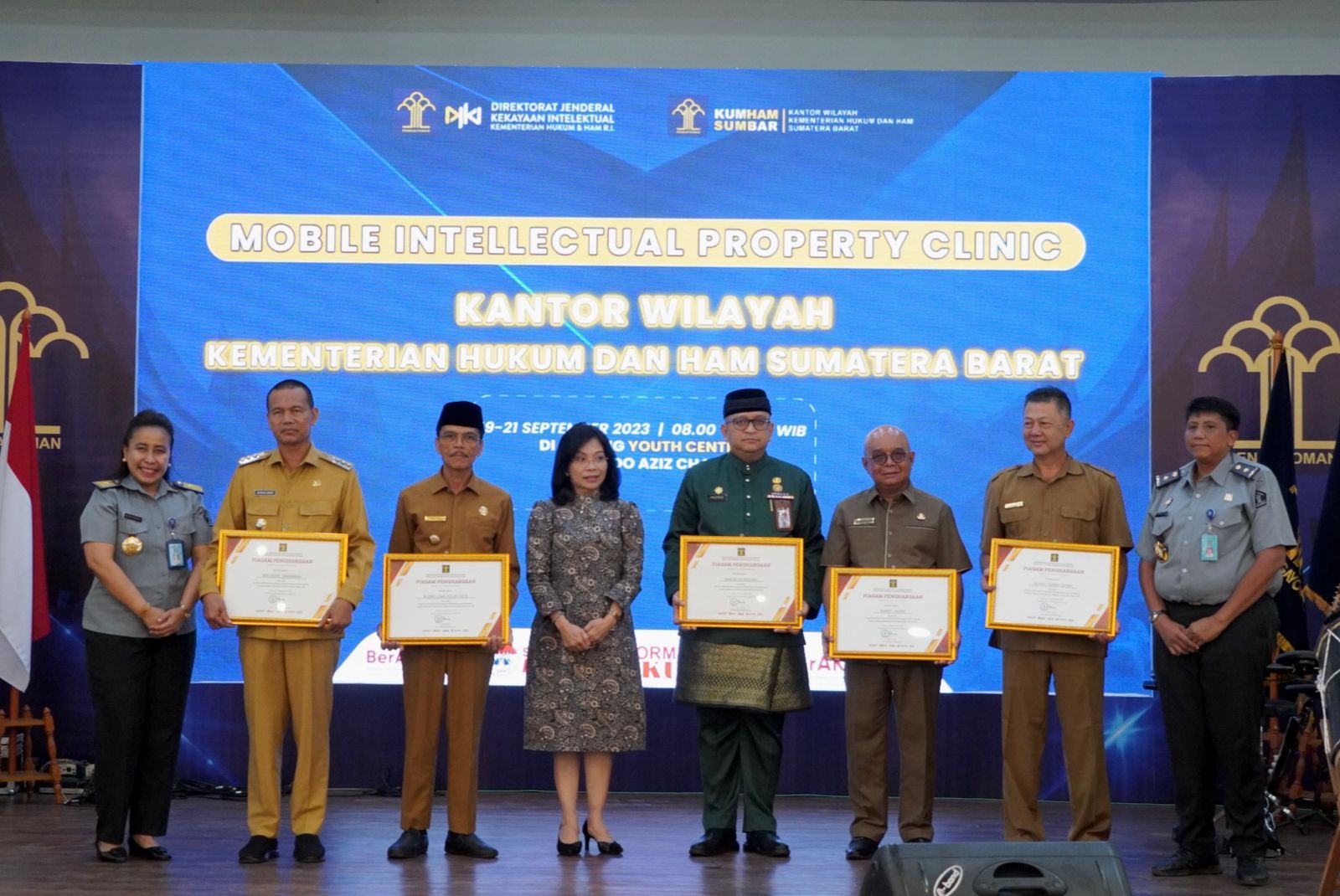 Limapuluh Kota, — Berperan aktif dalam membangun dan melindungi serta mendukung Program Kekayaan Intelektual di tahun 2023, Pemerintah Kabupaten Limapuluh Kota menerima penghargaan dari Kementerian Hukum dan Hak Asasi Manusia Republik Indonesia (Kemenkumham RI). Penghargaan tersebut diserahkan oleh Direktur Jenderal Kekayaan Intelektual Min Usihen kepada Bupati Lima Puluh Kota Safaruddin Dt. Bandaro Rajo pada acara Mobile Intellectual Property Clinic yang diselenggarakan di Youth Centre Bagindo Aziz Chan Padang, Selasa (19/09/2023).